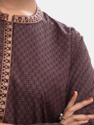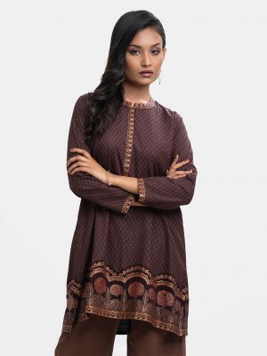 Light brown viscose printed tunic with side pockets. Embellished with front buttons and gathers on sleeves opening.