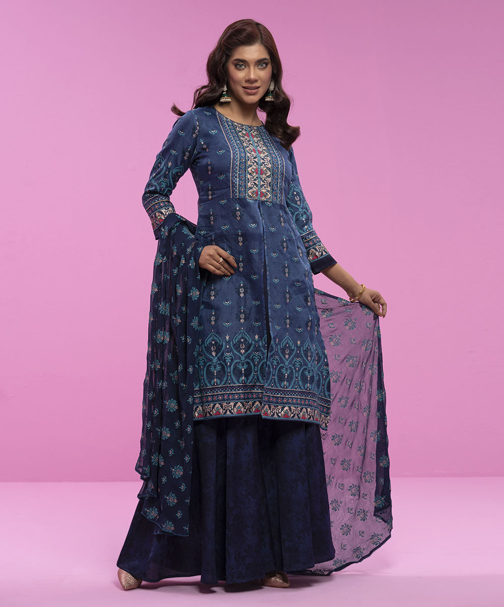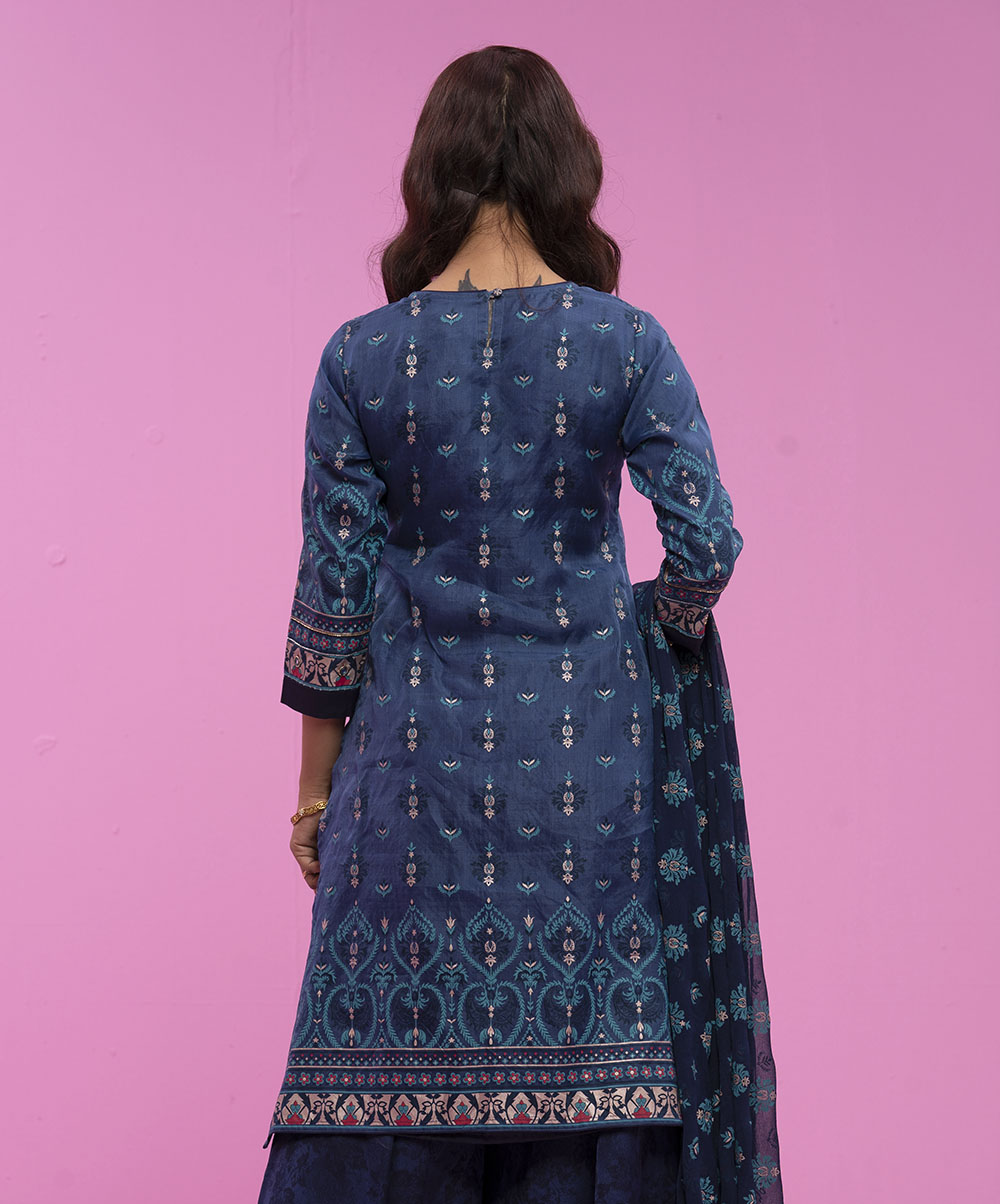 Allover screen printed muslin kameez with karchupi & sarara with tie-dyed orna.
