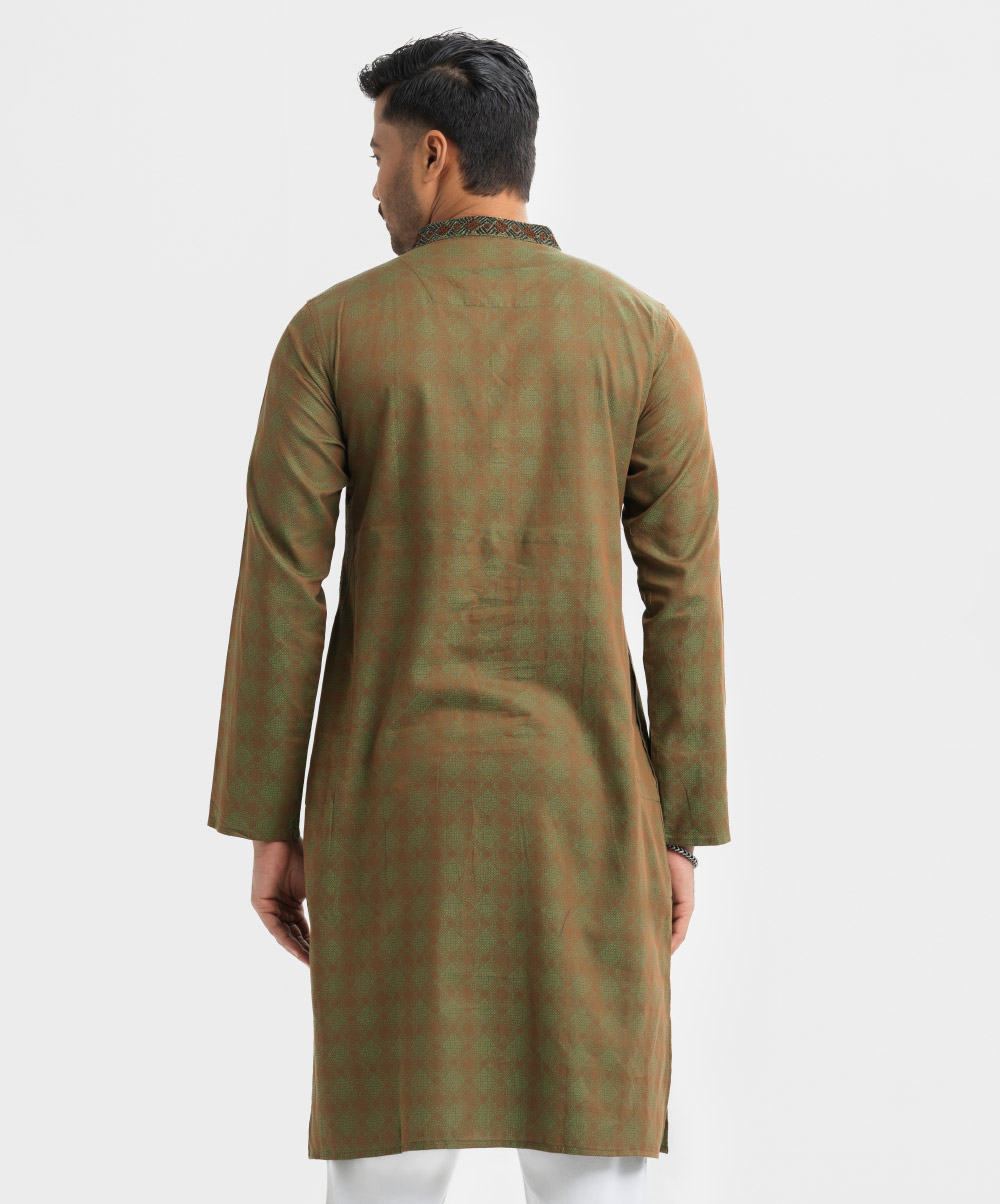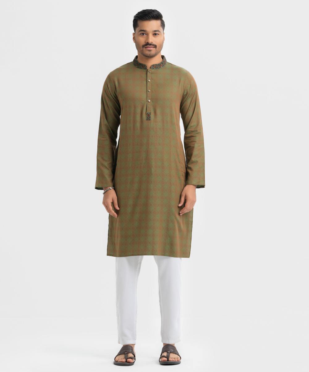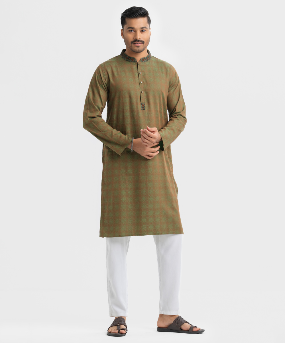 Men’s slim fitted panjabi in jacquard fabric. Karchupi at mandarin collar with metal buttons on the placket & full sleeves.