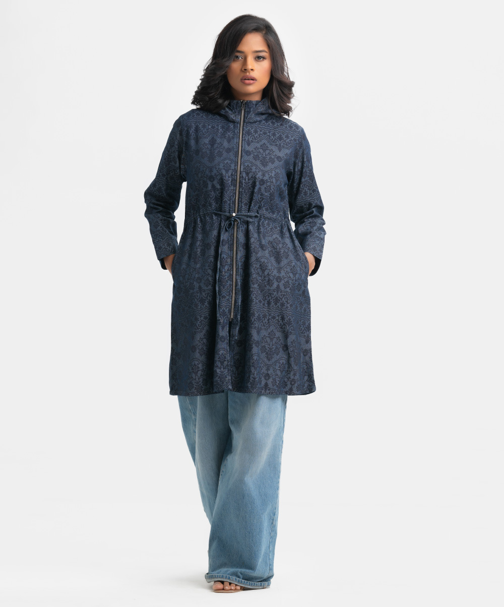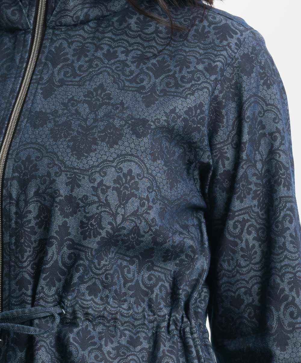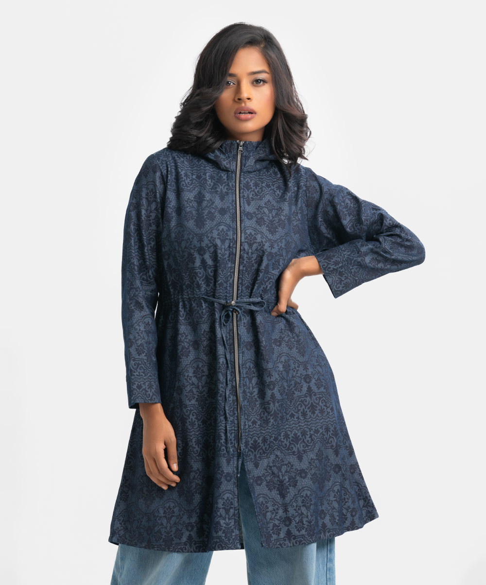 Women’s printed long-sleeved hoddie tunic in denim fabric. Adjustable hood with front zipper placket. Inseam side pockets with waistline tie-cord at front.