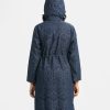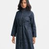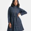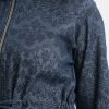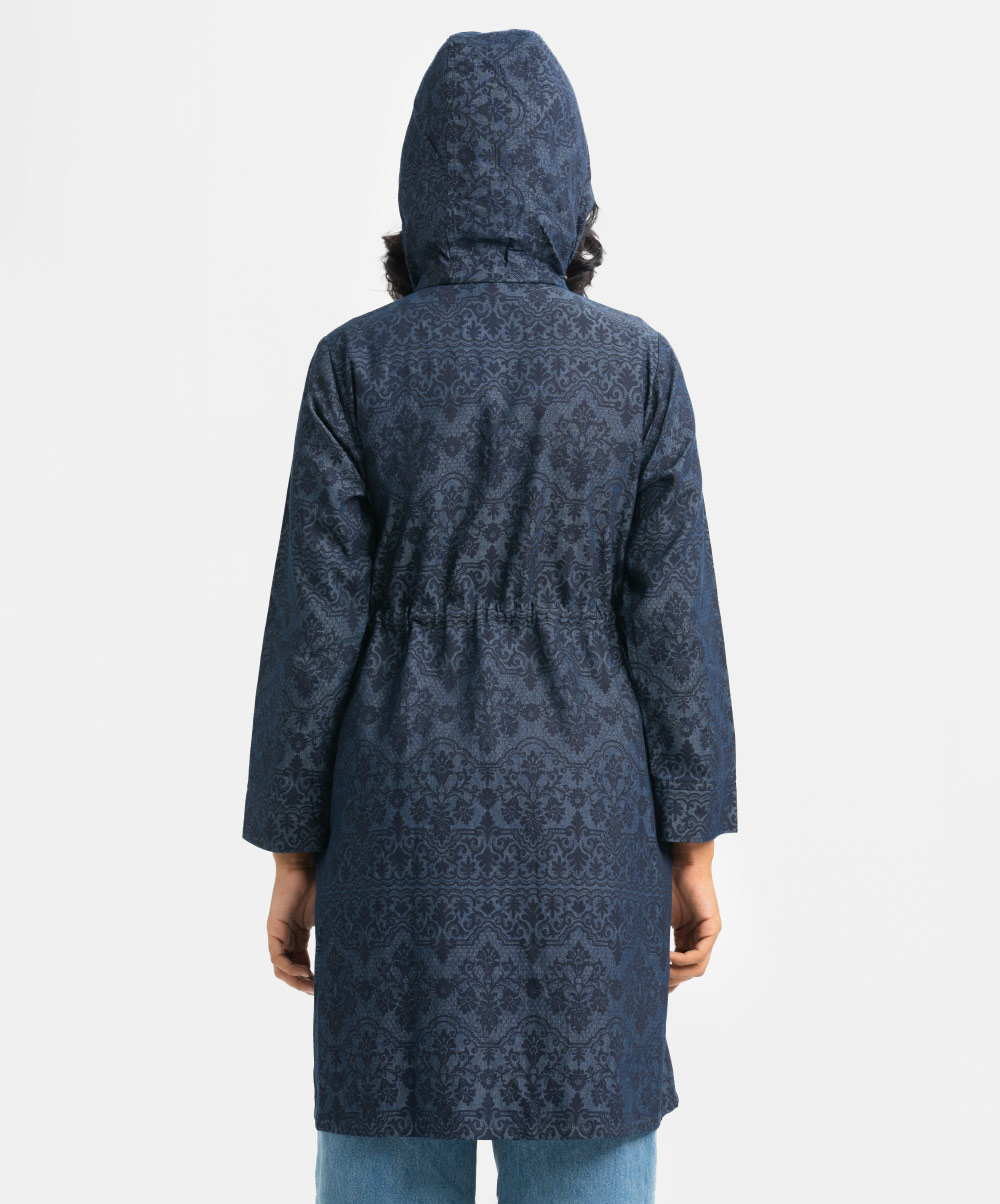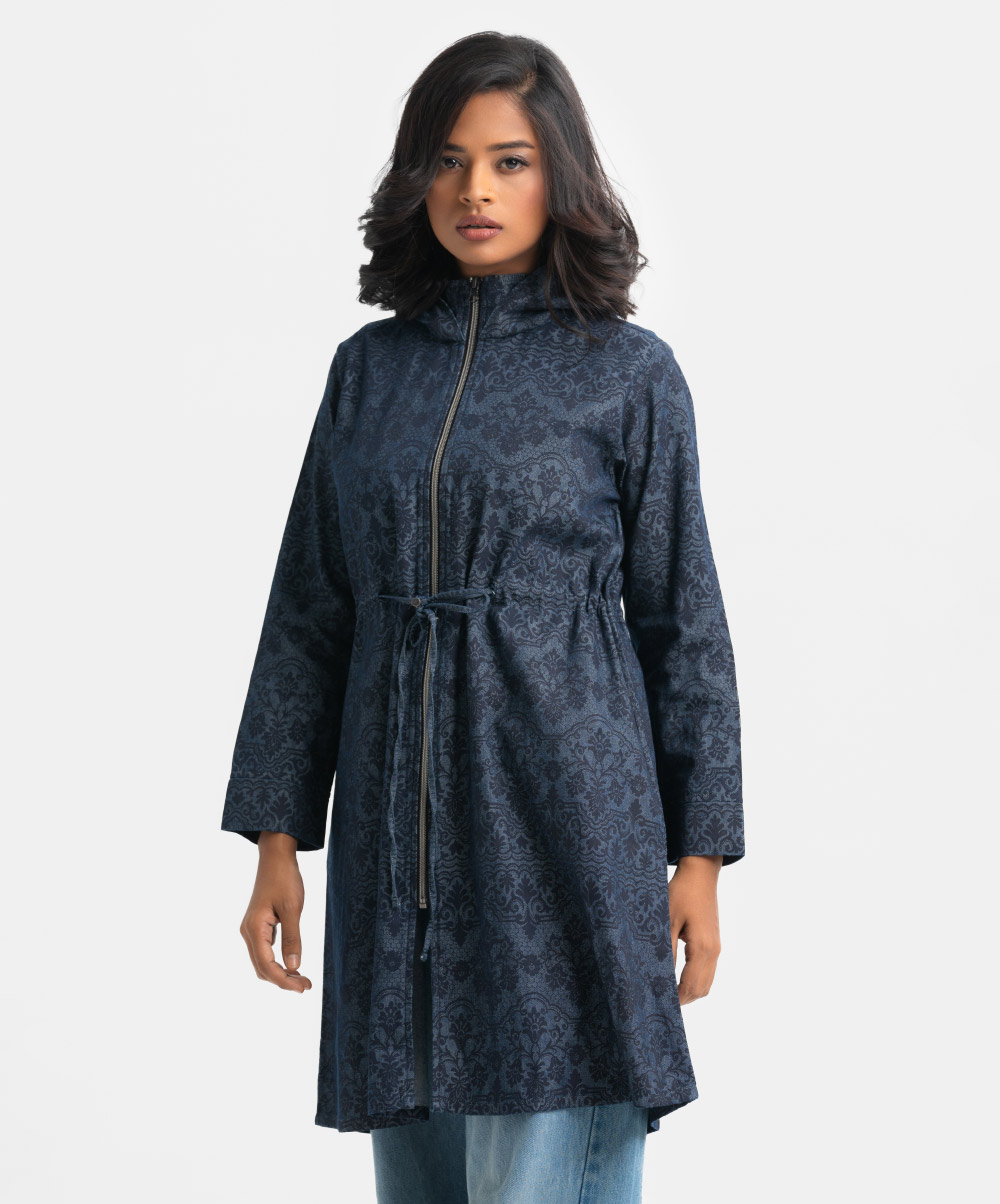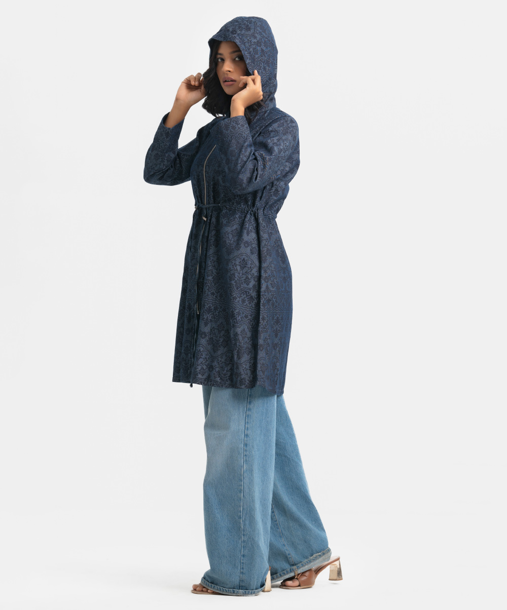 Women’s printed long-sleeved hoddie tunic in denim fabric. Adjustable hood with front zipper placket. Inseam side pockets with waistline tie-cord at front.