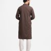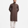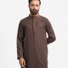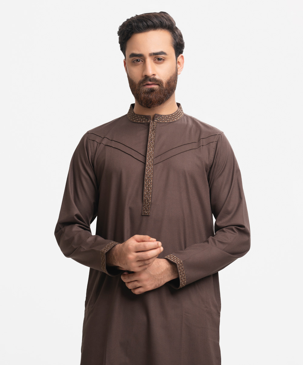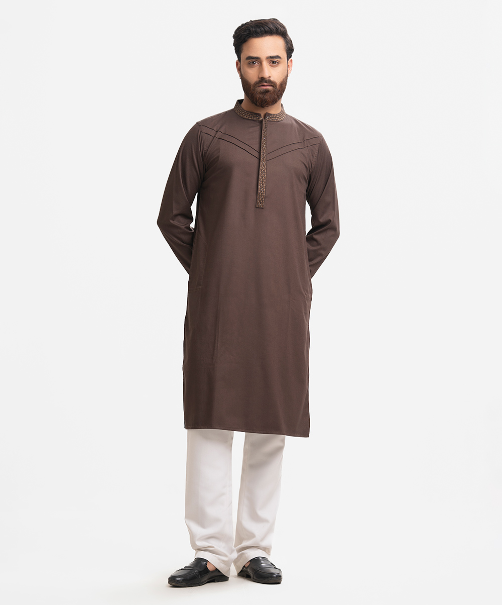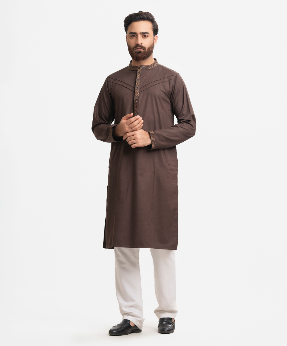 Stand-collar fitted panjabi in bamboo jacquard fabric. Embroidery and karchupi details on the collar and hidden placket.