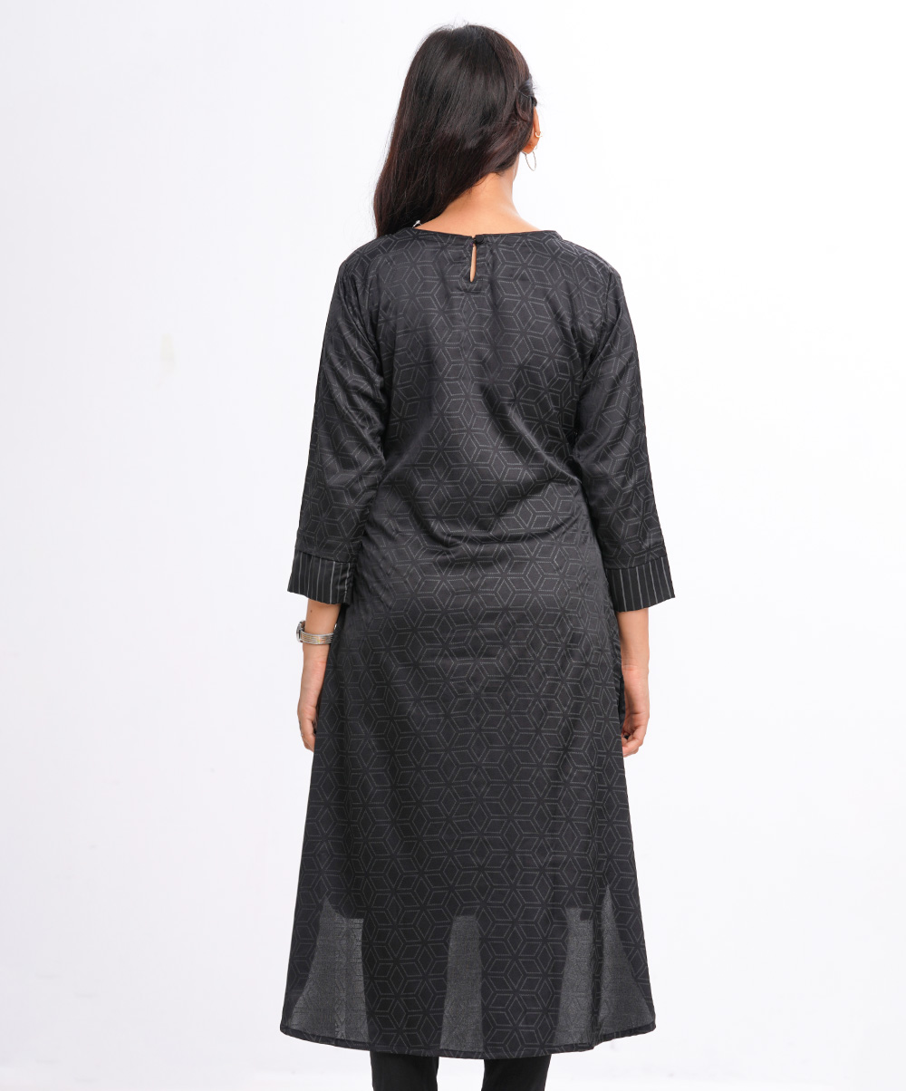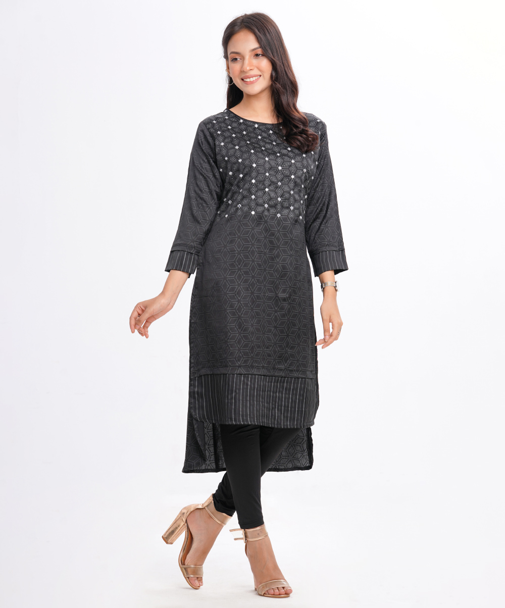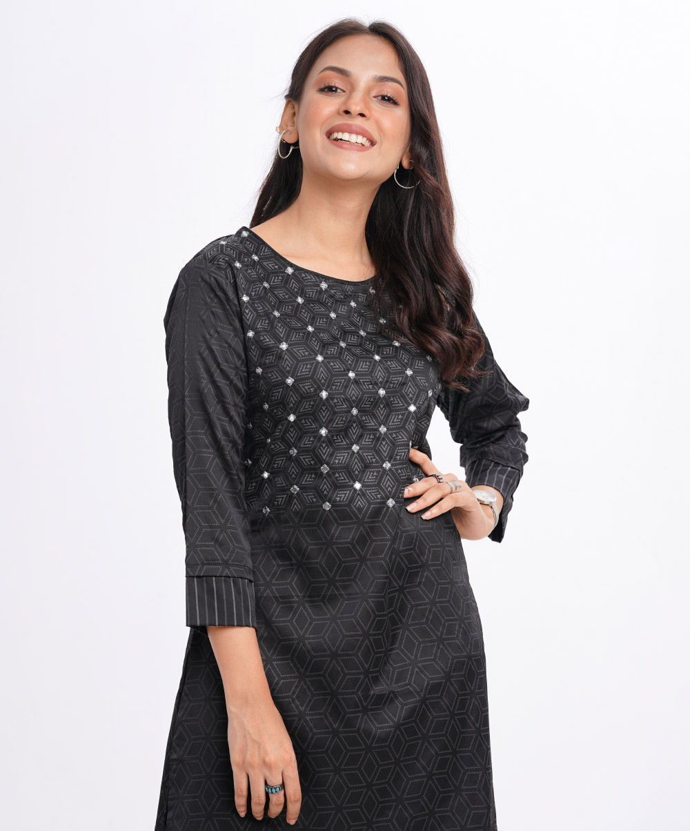 Black all-over printed straight-cut Kameez in Crepe fabric. Designed with a round neck and three-quarter sleeves. Embellished with embroidery at the top front. High-low hem.