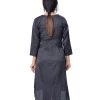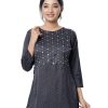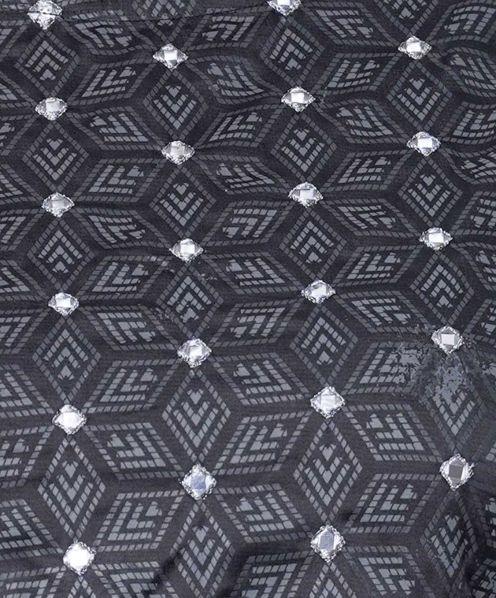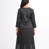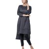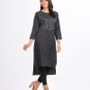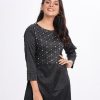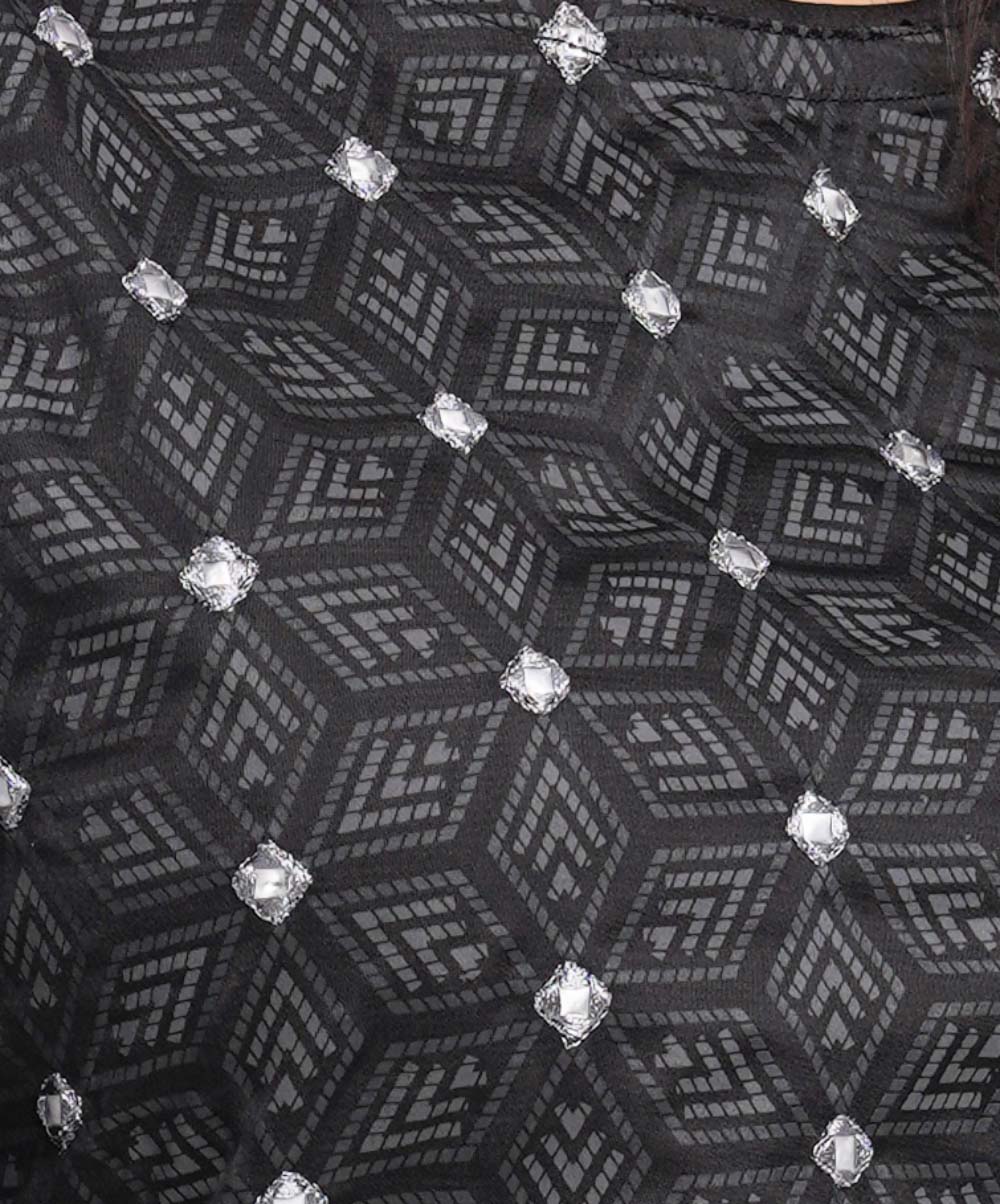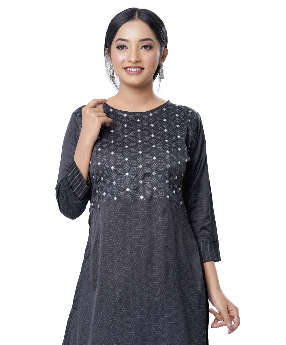 Black all-over printed straight-cut Kameez in Crepe fabric. Designed with a round neck and three-quarter sleeves. Embellished with embroidery at the top front. High-low hem.