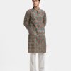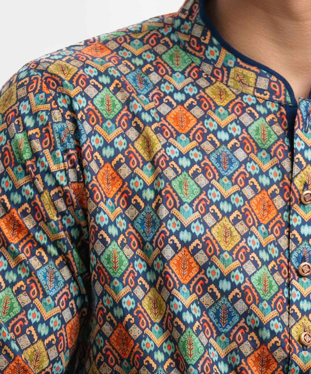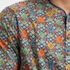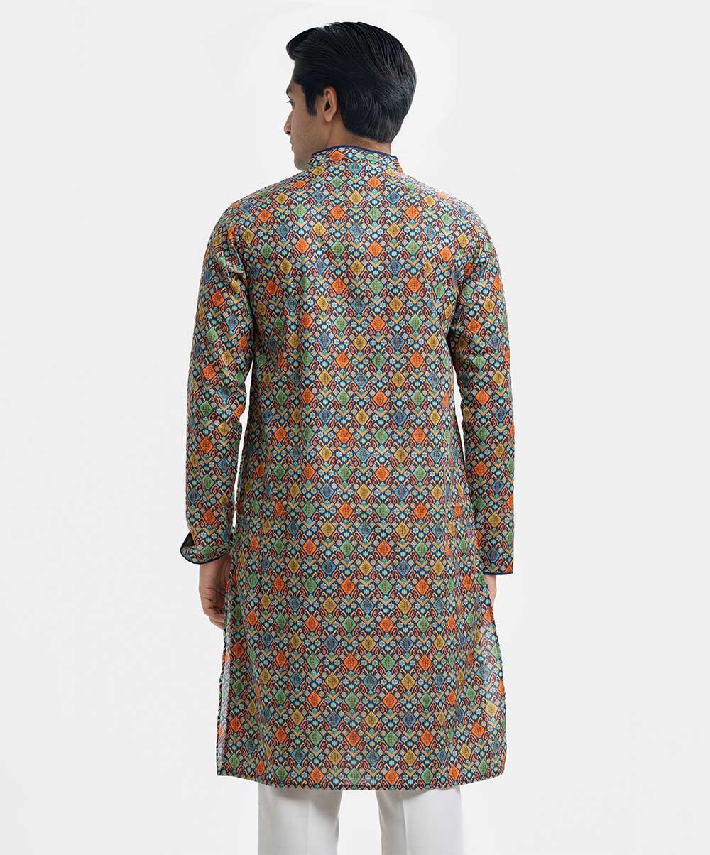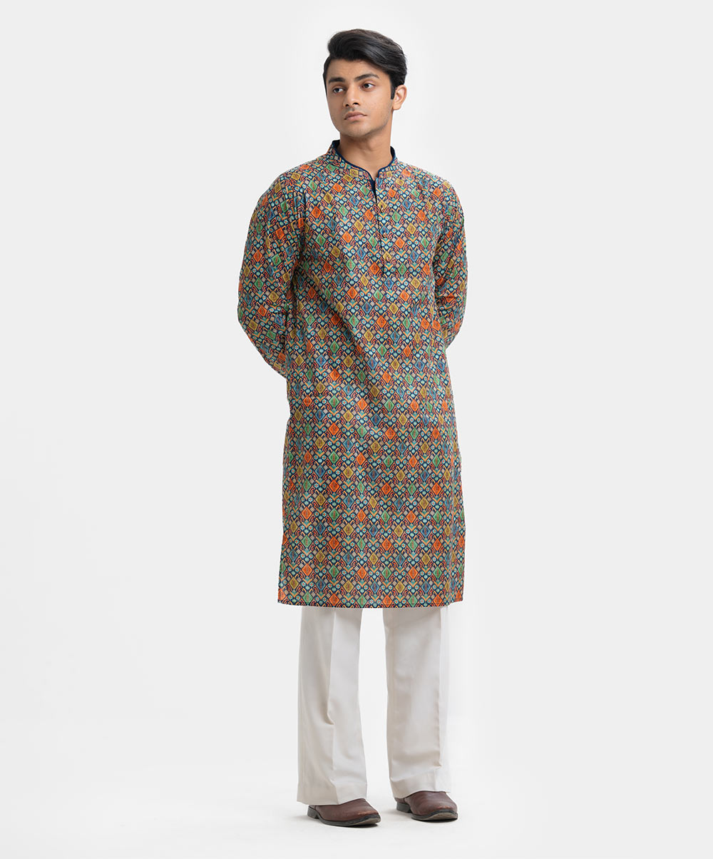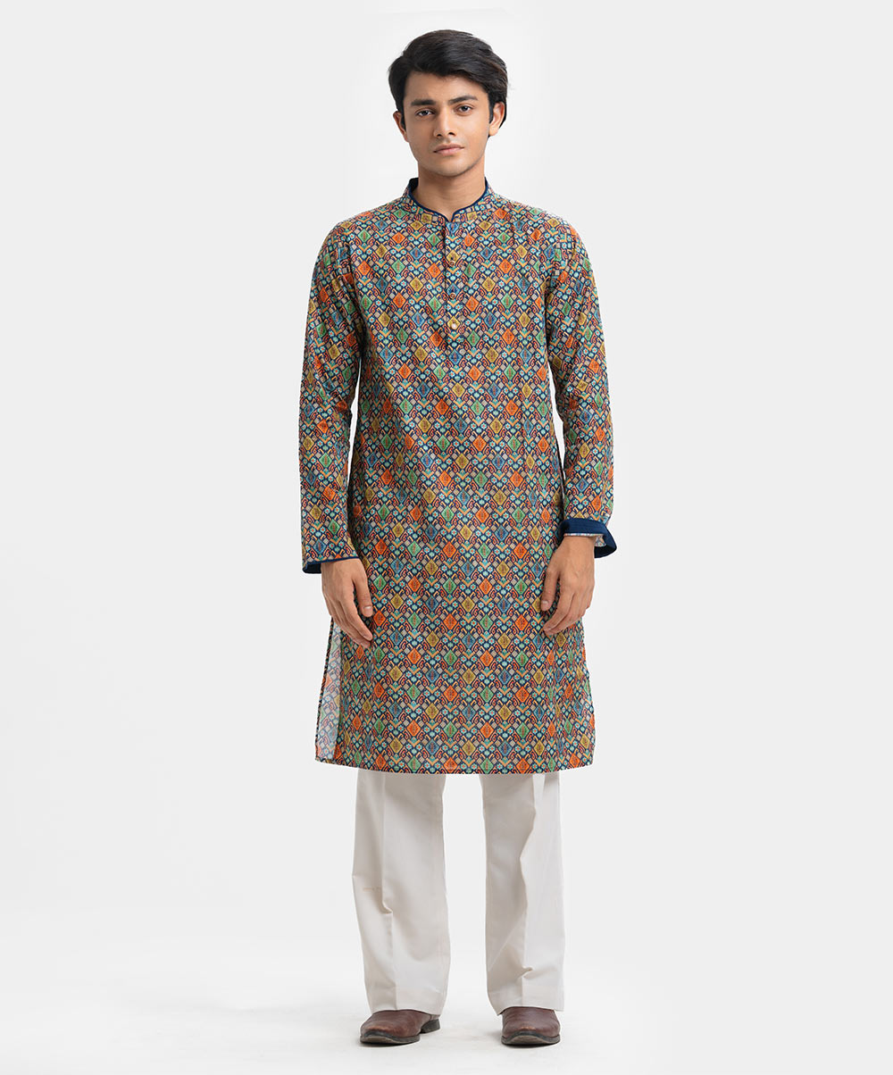 Men’s semi fitted panjabi in printed cotton fabric. Mandarin collar, buttons placket & full sleeves. Inseam pockets.