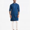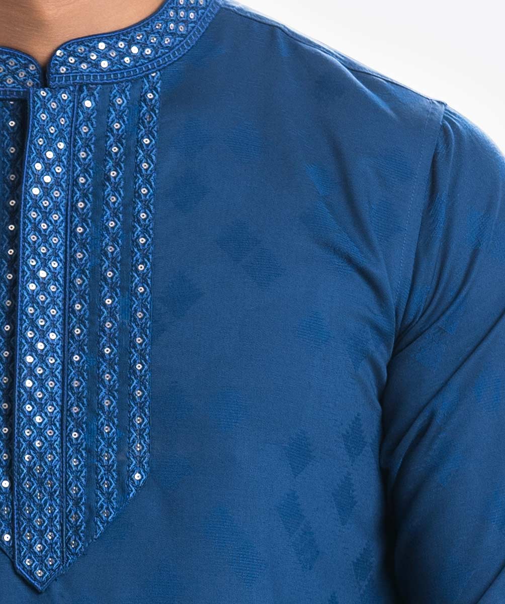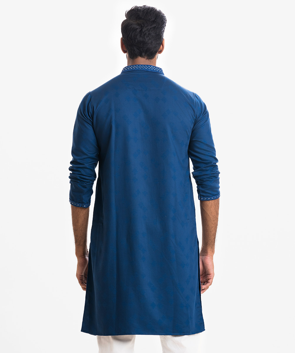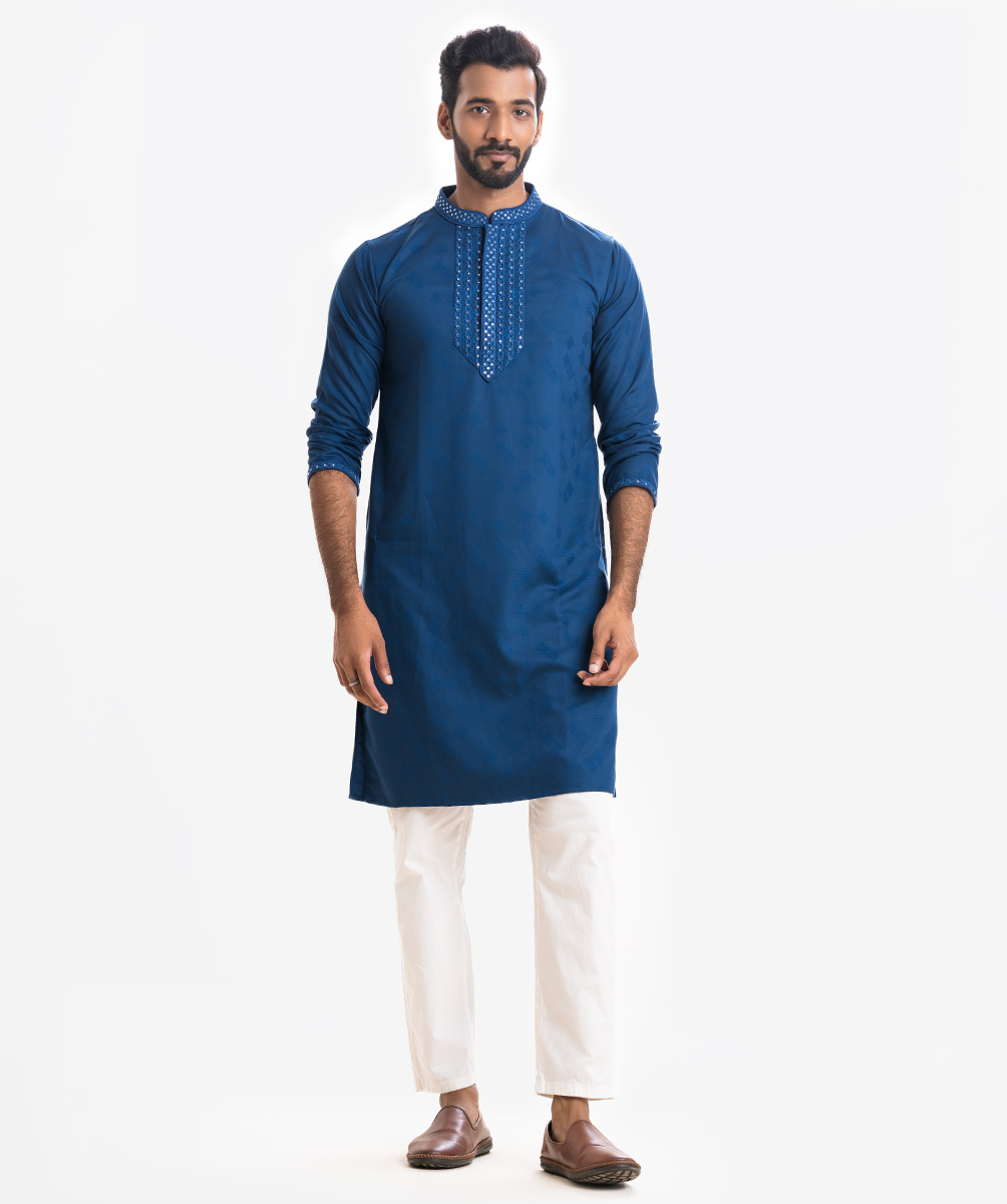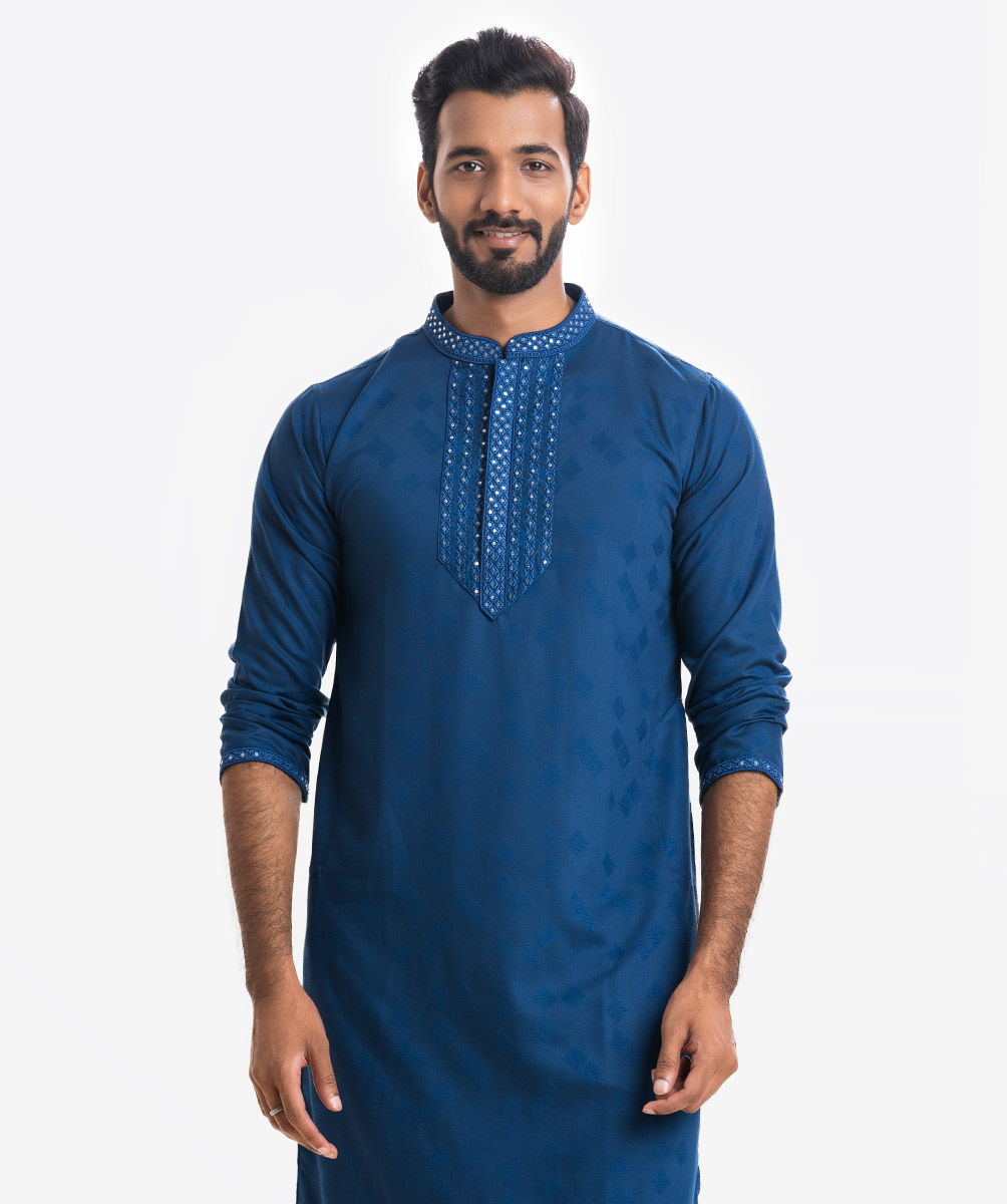 Men’s fitted panjabi in jacquard cotton fabric. Karchupi at front and hidden button placket.