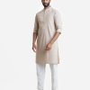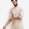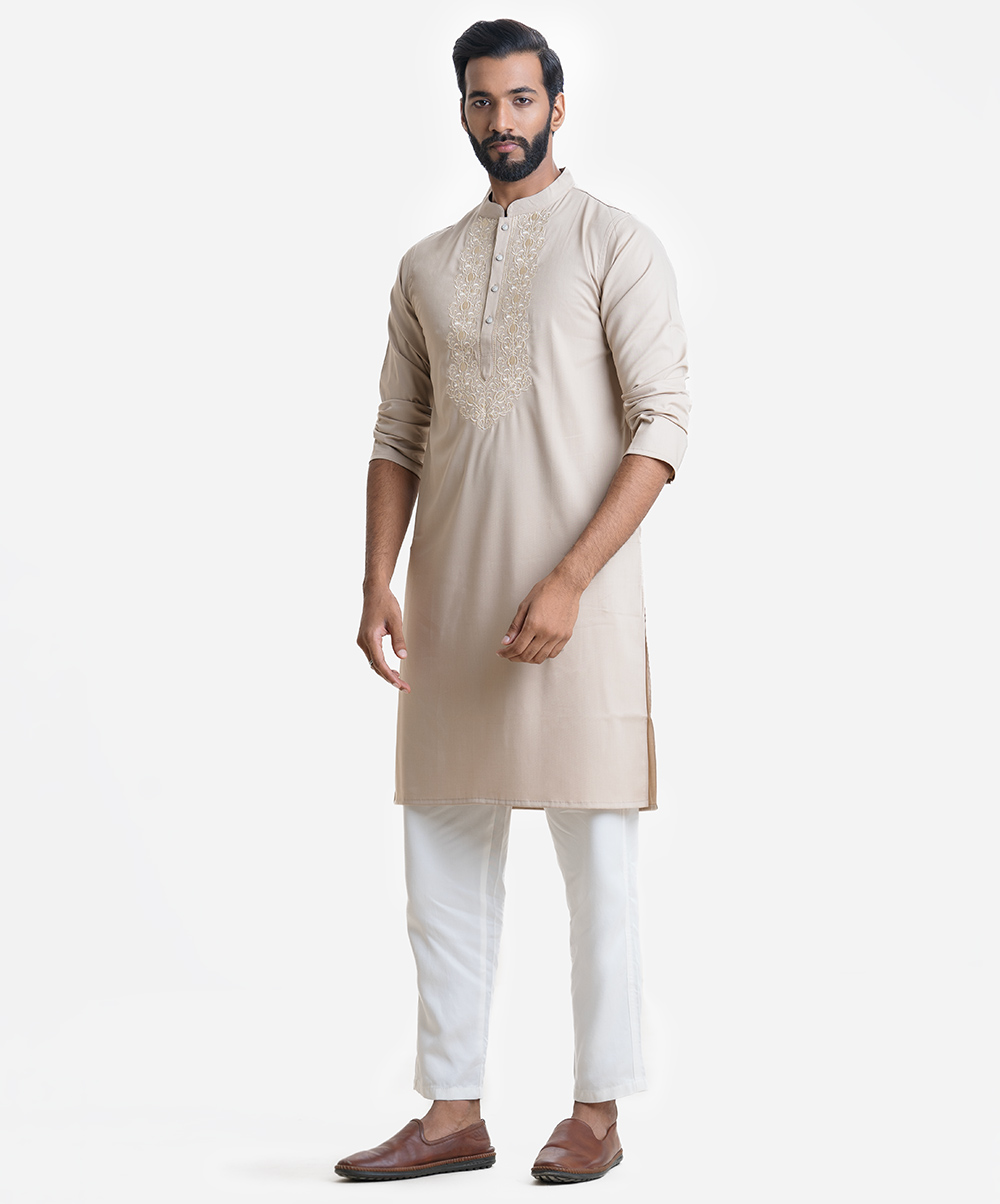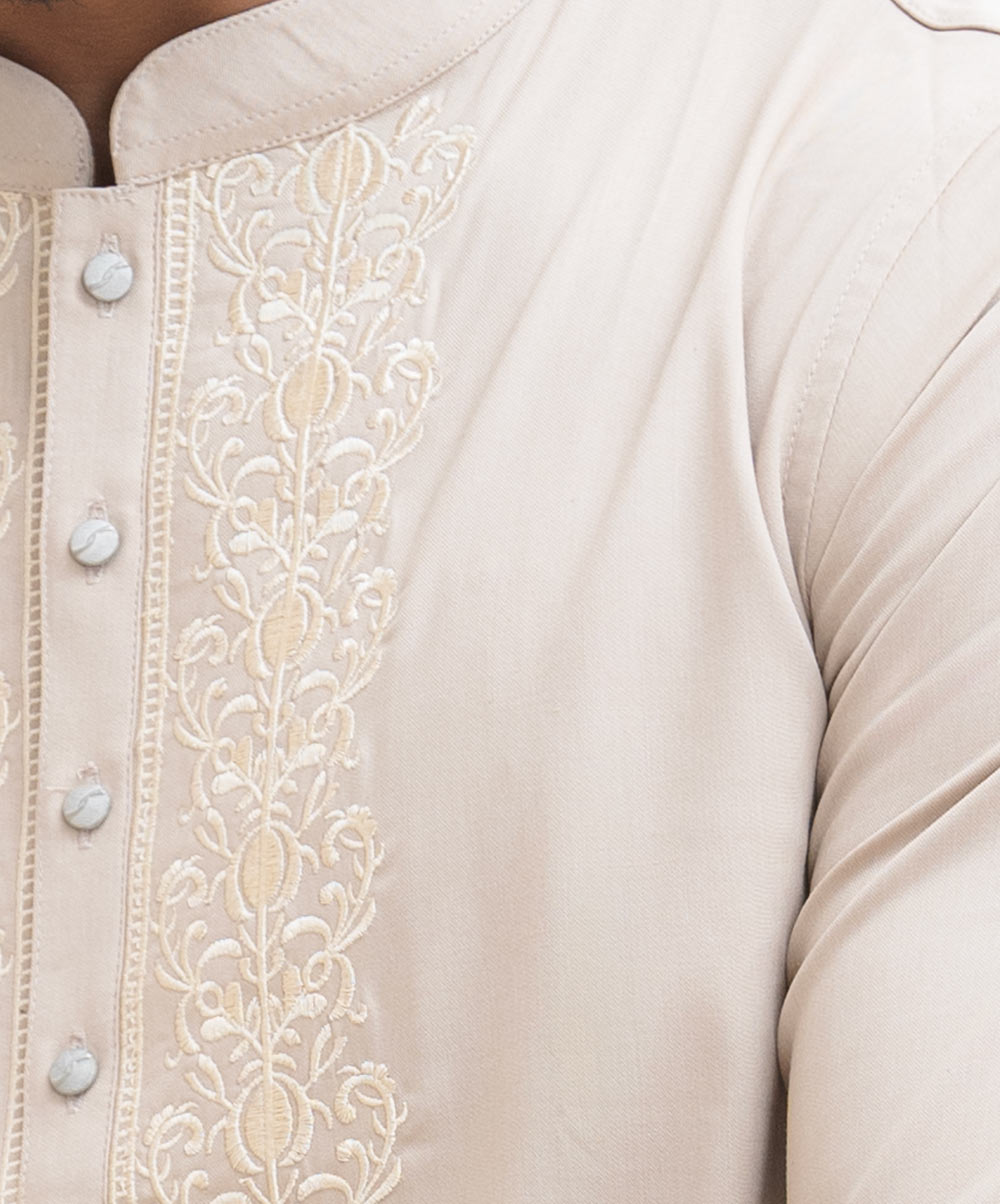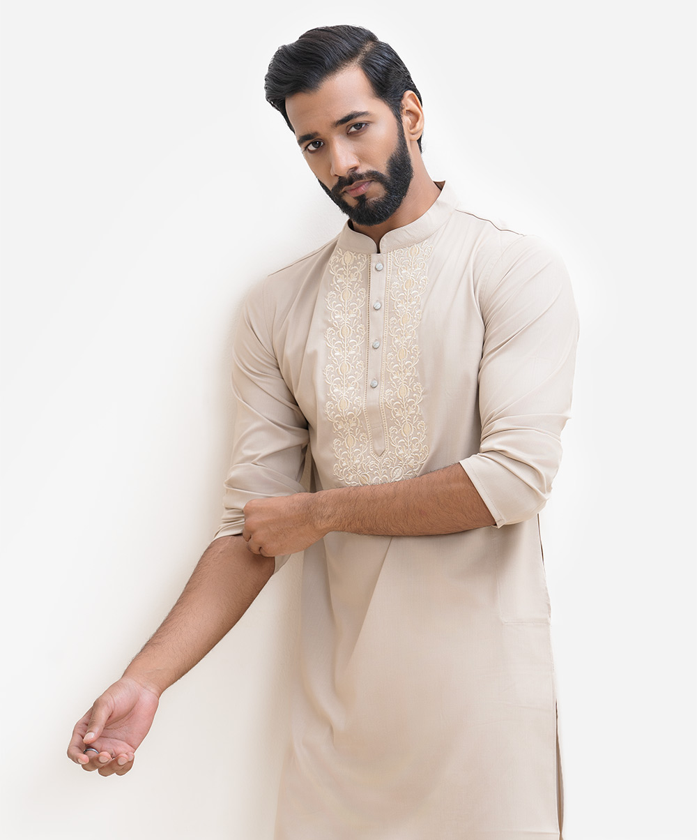 Men’s semi fit panjabi in jacquard fabric. Mandarin collar and inseam side pockets. Embroidery at front.