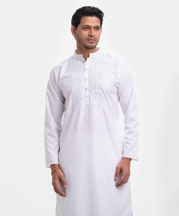 Classic semi fitted cotton-blend panjabi with embroidery on the collar and placket.