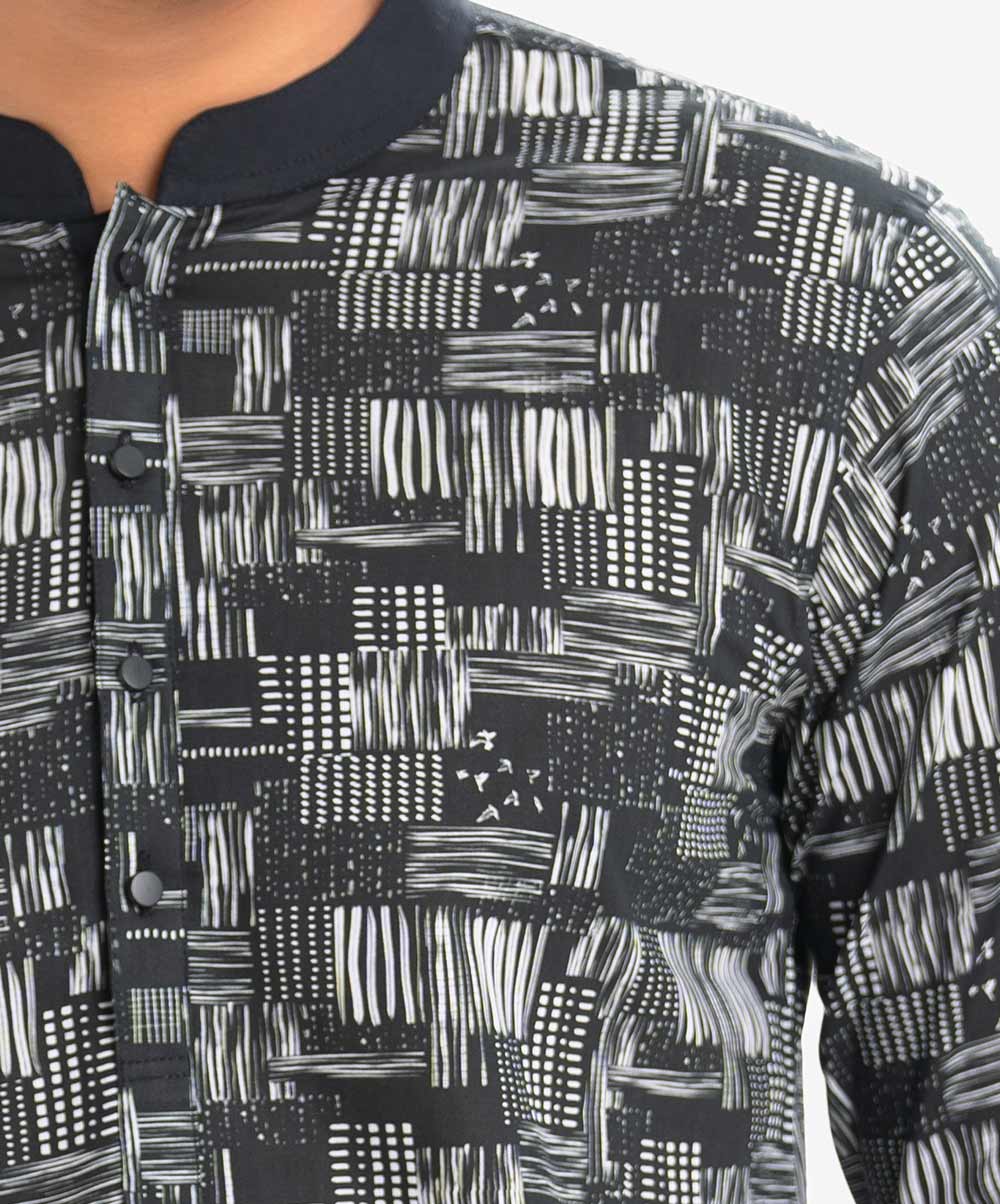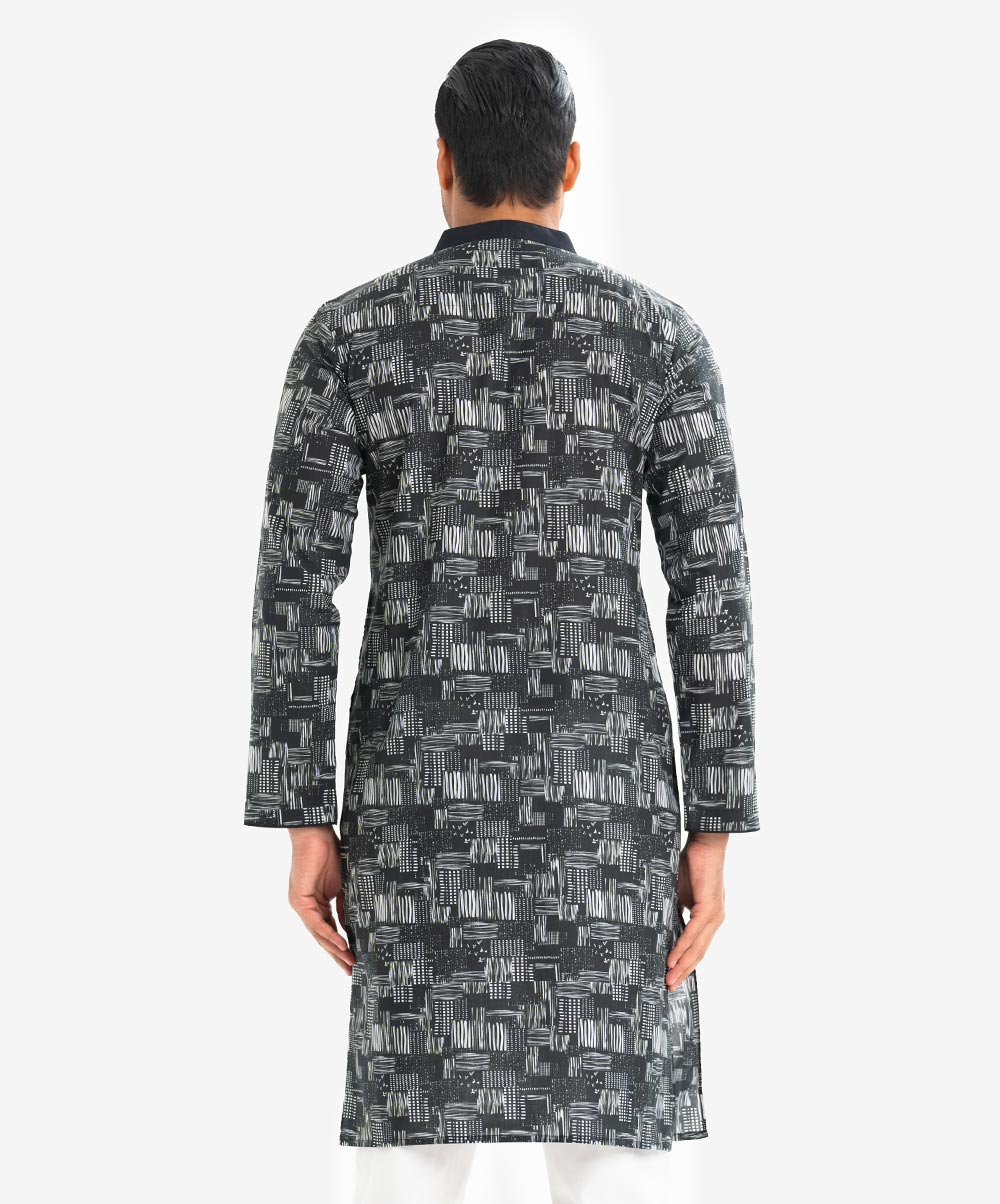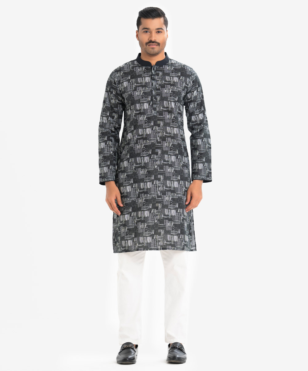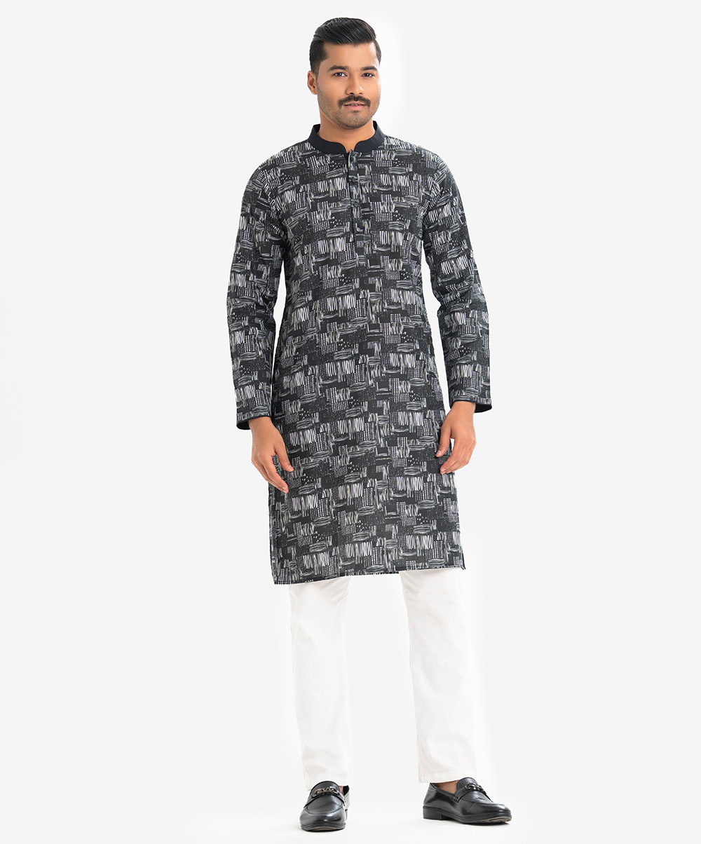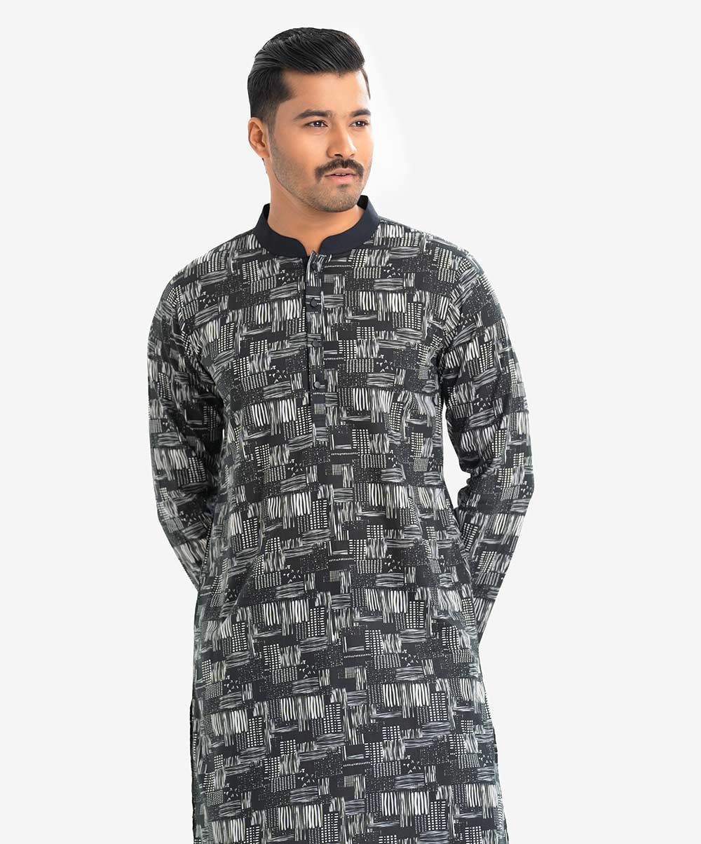 Men’s printed semi-fitted panjabi in cotton fabric. Mandarin collar, inseam pockets and long sleeves.