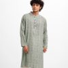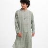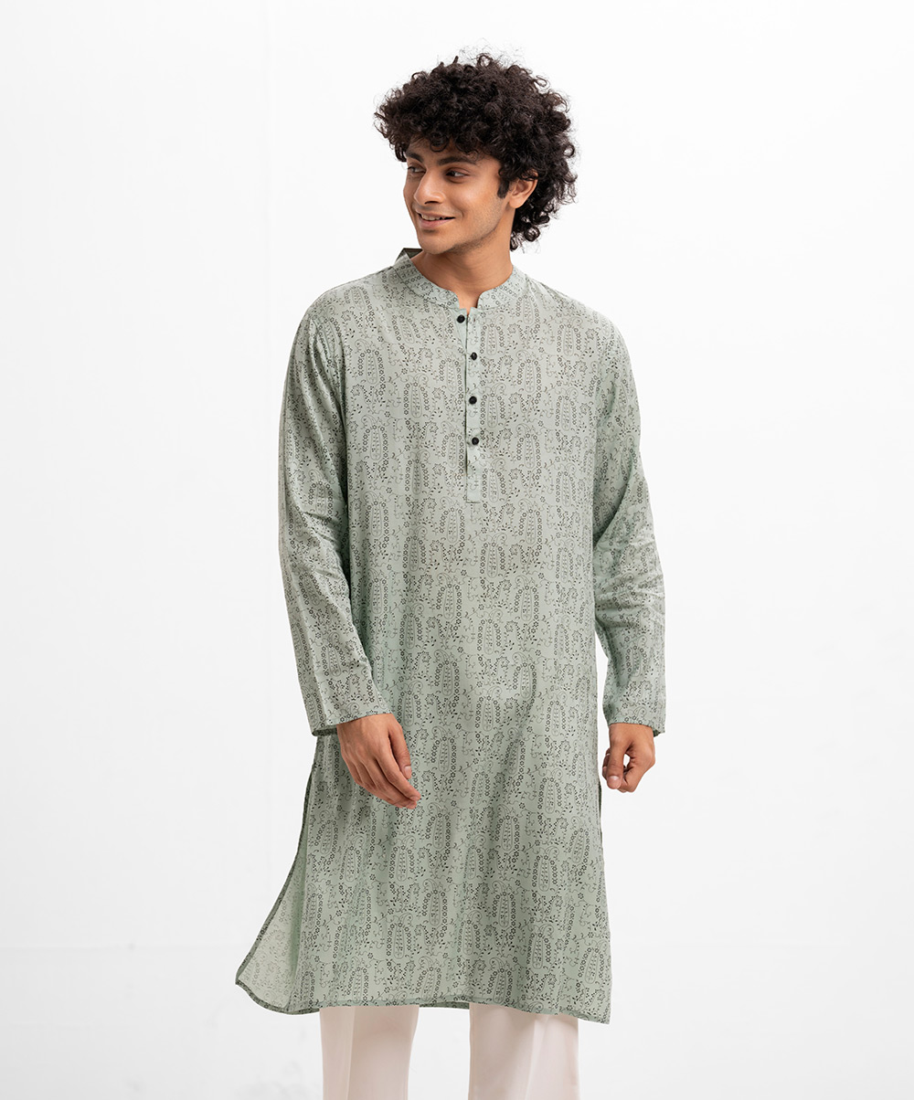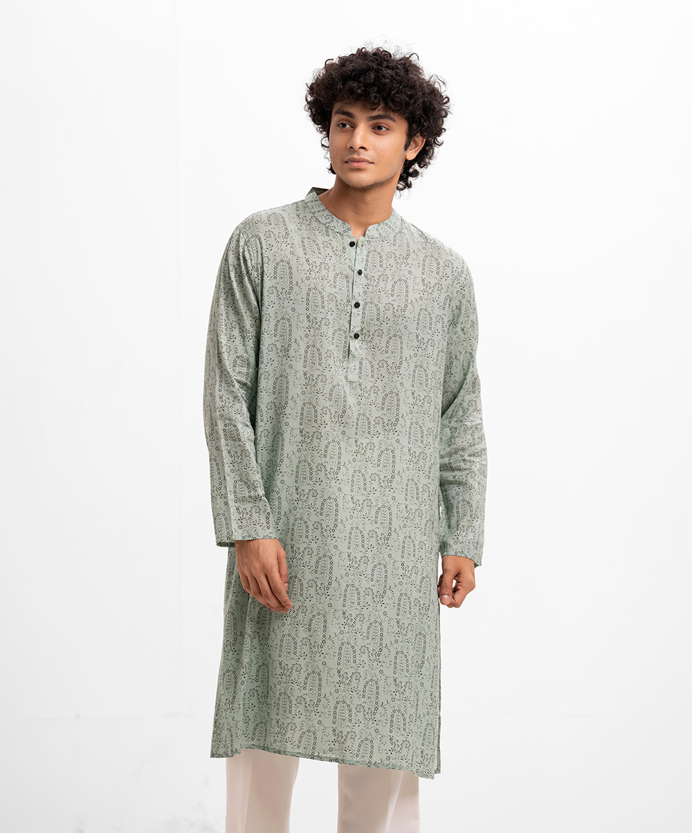 All over printed semi fitted panjabi in cotton fabric. Mandarin collar, full sleeves and inseam pockets.