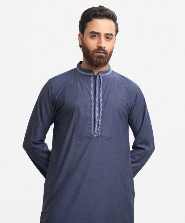 Men’s semi fitted panjabi in blended fabric. Long sleeves, inseam side pockets. Embroidery on the collar and placket.