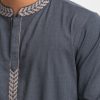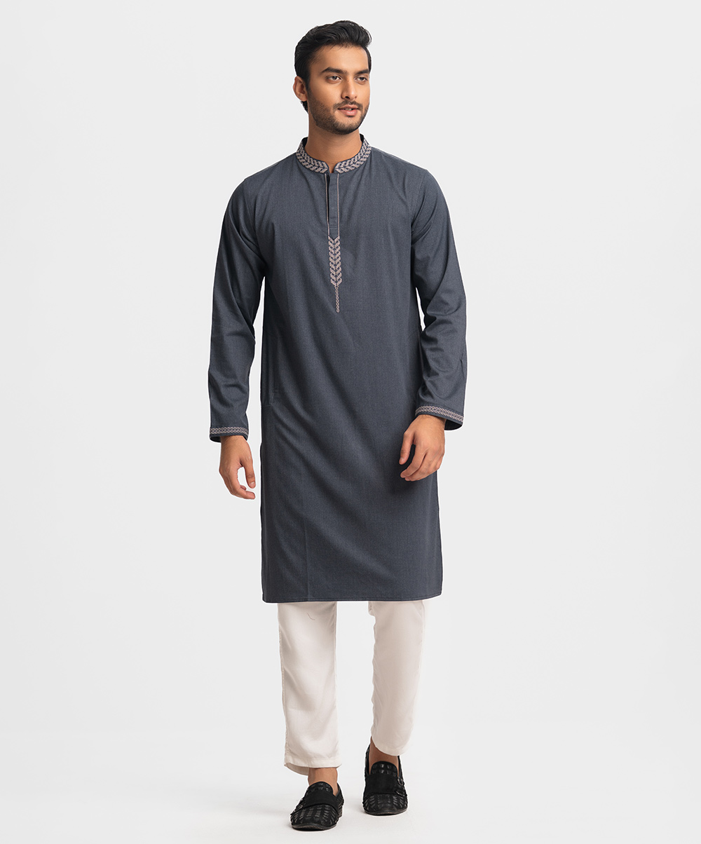 Men’s semi fitted panjabi in blended fabric. Embroidery on the collar and placket. Inseam side pockets.