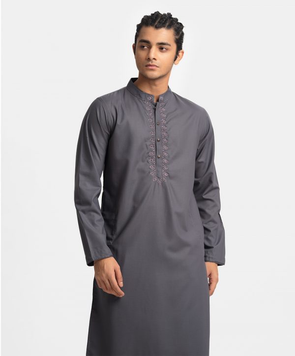 Semi Fitted panjabi with a band collar in blended fabric. Handstitched on the collar and placket.