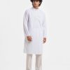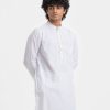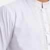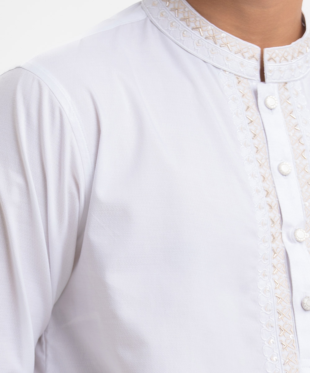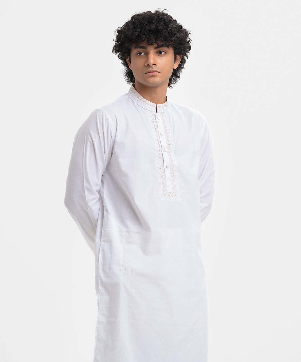 Men’s semi-fitted panjabi in cotton fabric. Mandarin collar, inseam pockets and long sleeves. Embroidery at the collar and placket.