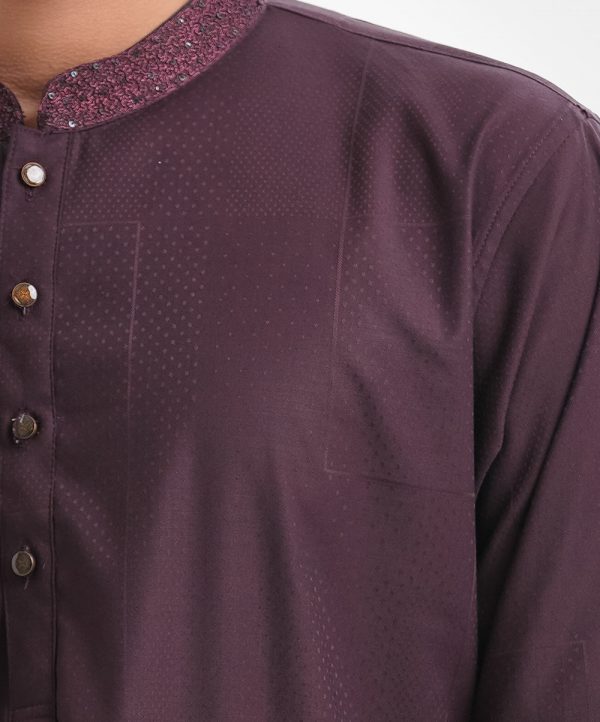 Men’s semi fitted panjabi in jacquard fabric. Karchupi works at mandarin collar. Buttons placket & full sleeves. Inseam pockets.