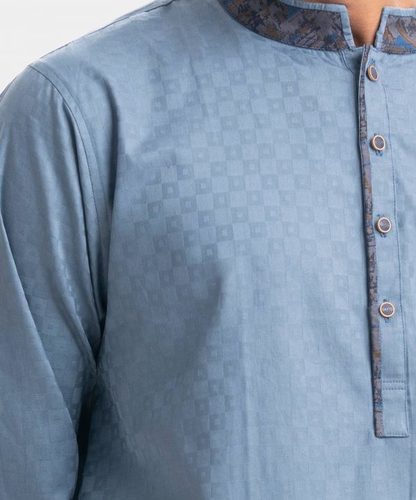 Semi-fitted cotton jacquard panjabi in cotton jacquard fabric. Matching patch on the collar and placket. Inseam side pockets.
