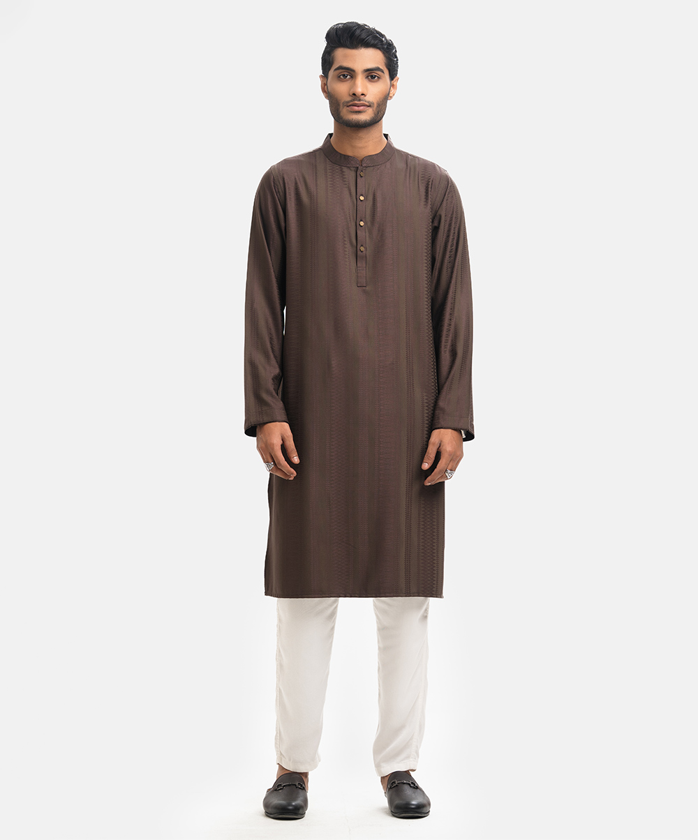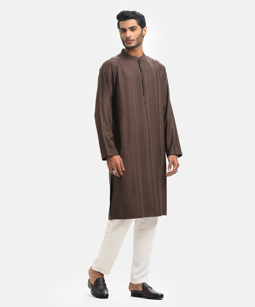 Men’s semi-fitted panjabi in cotton Jacquard fabric. Mandarin collar & metal buttons placket. Full sleeves and inseam pockets.