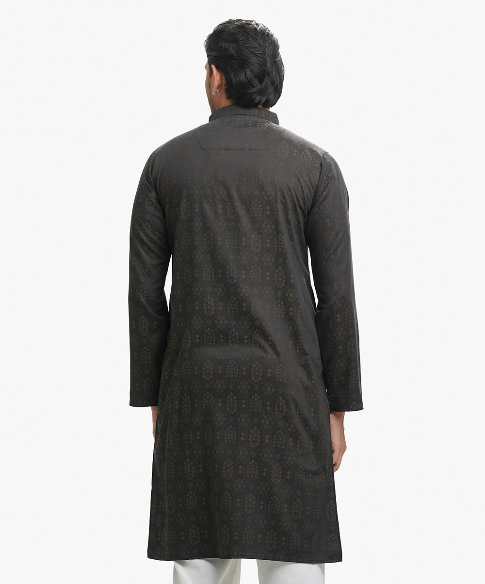 Men’s semi-fitted panjabi in cotton Jacquard fabric. Mandarin collar & metal buttons placket. Full sleeves and inseam pockets.