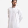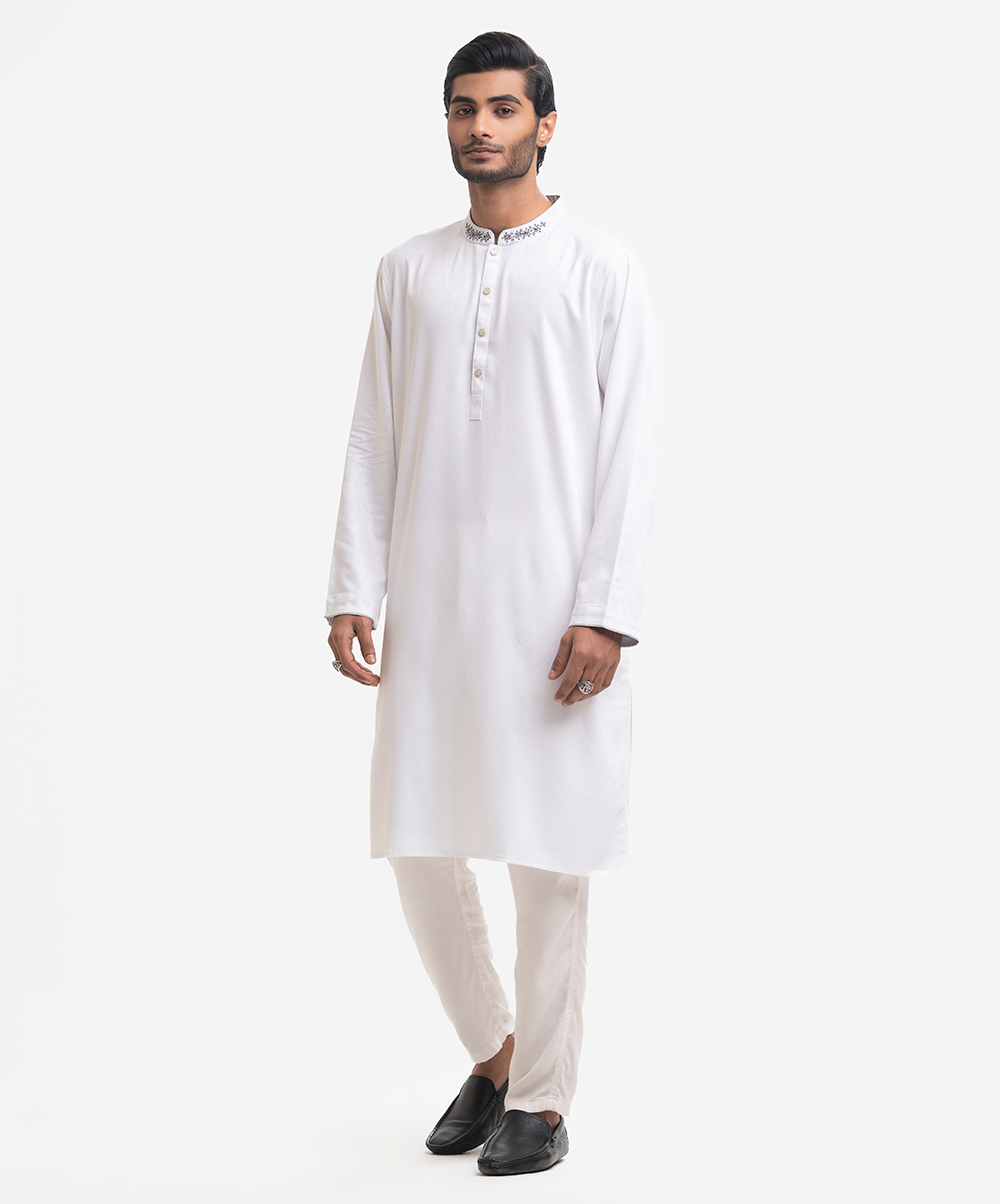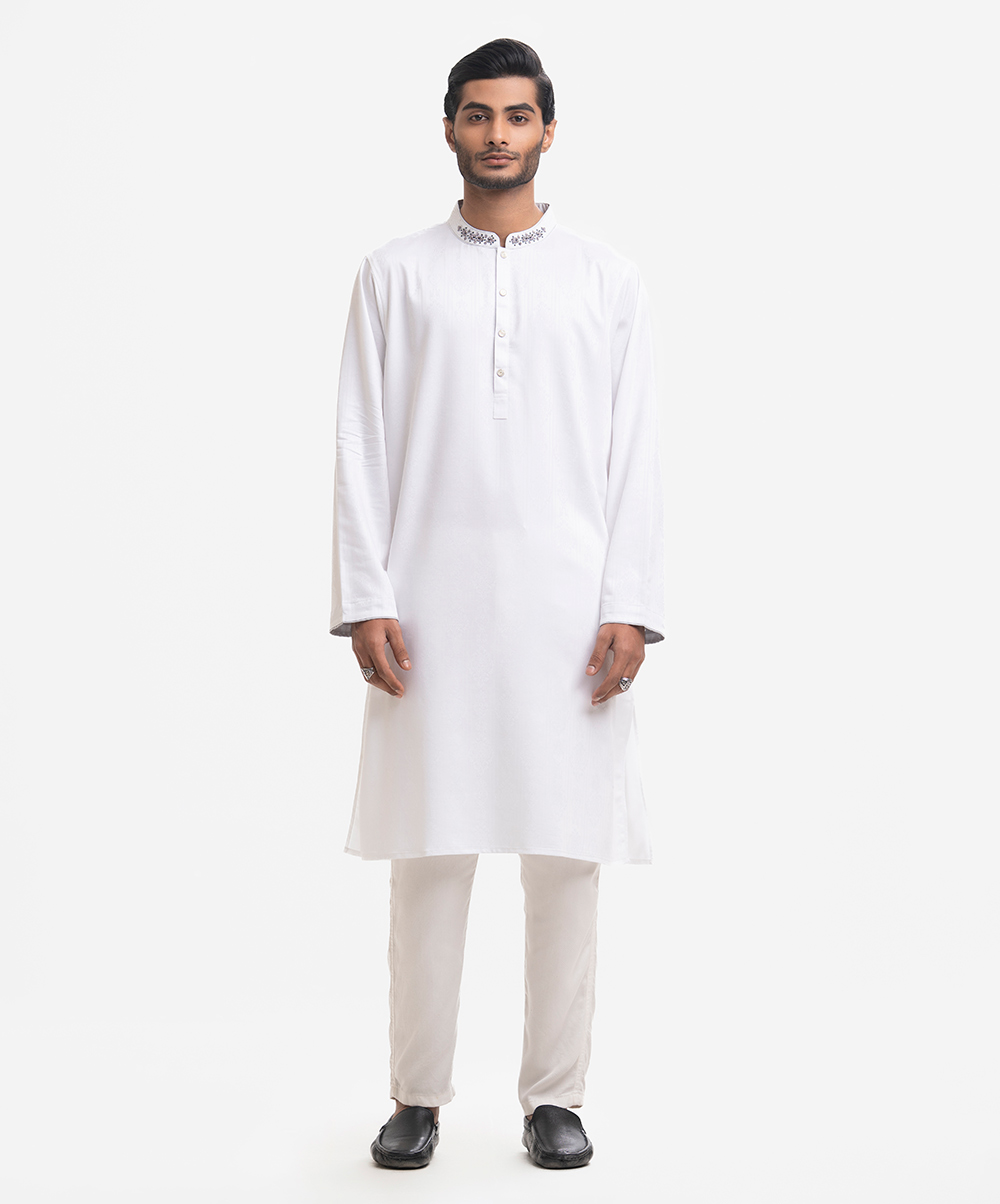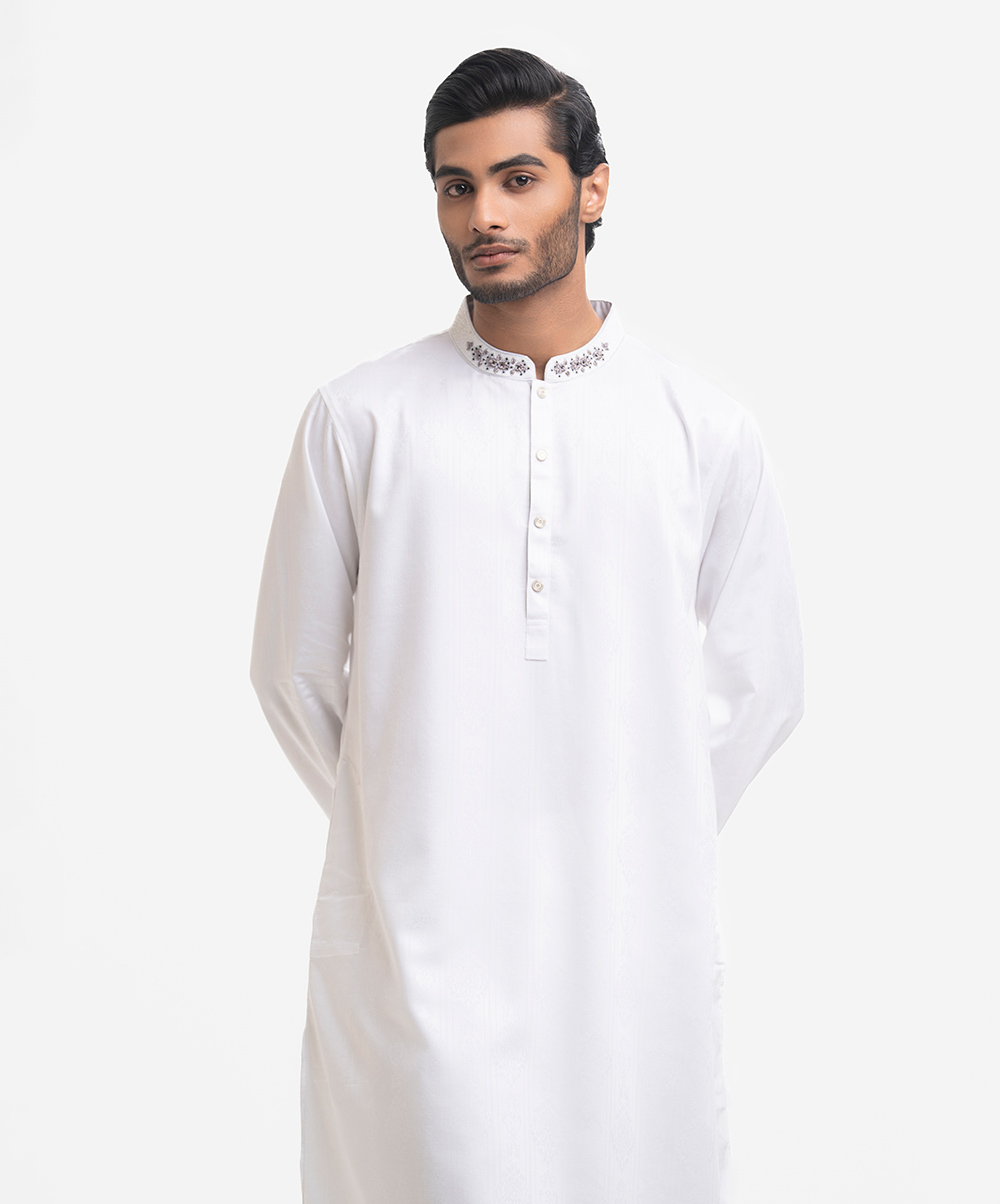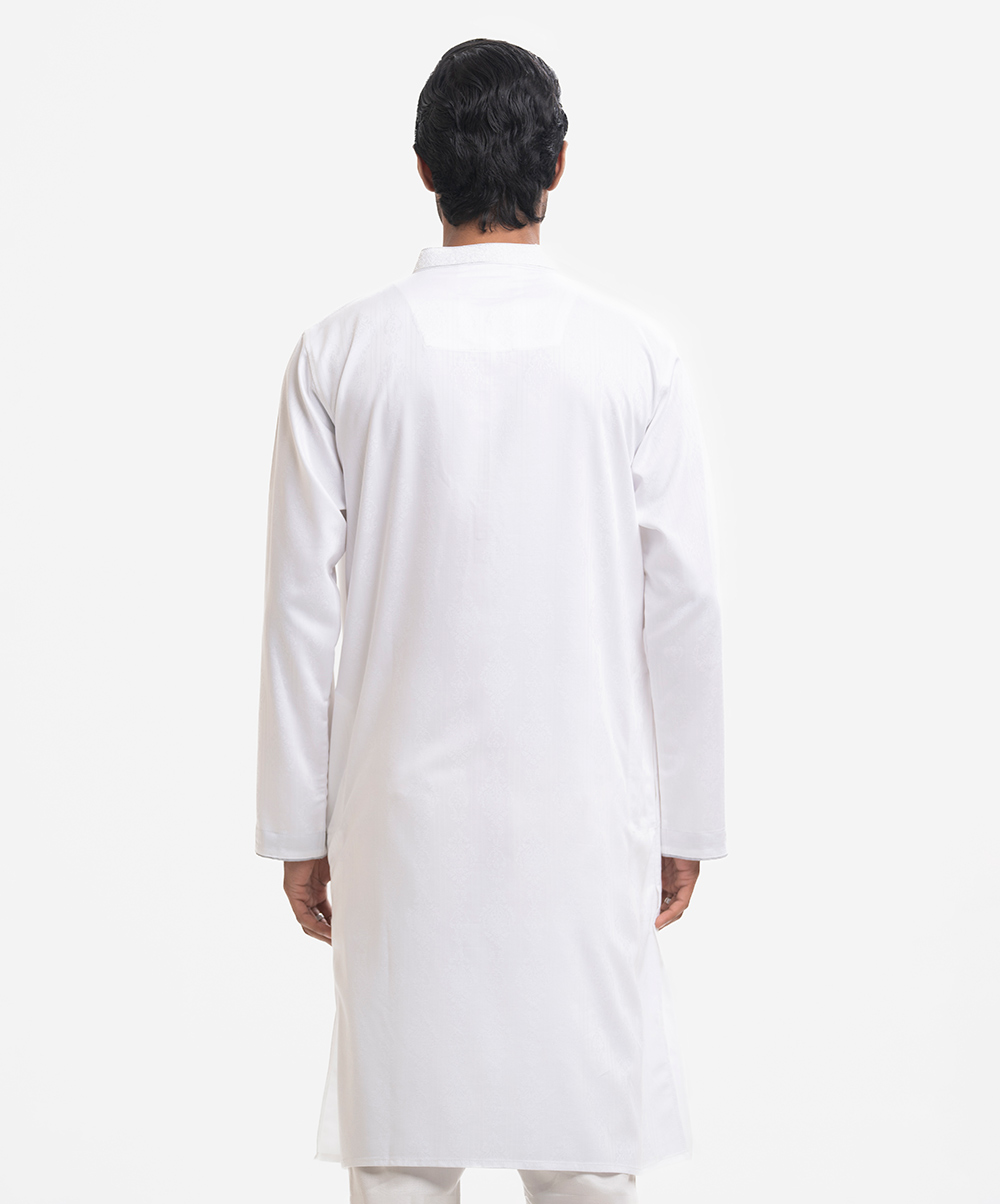 Men’s semi fitted panjabi in cotton jacquard fabric. Long sleeves, inseam side pockets. Karchupi on the collar.
