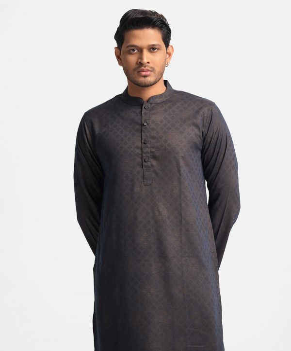 Men’s semi fitted panjabi in cotton jacquard fabric. Mandarin collar with metal buttons on the placket & full sleeves. Inseam pockets.
