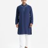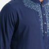 Men’s fitted panjabi in viscose fabric. Mandarin collar with metal buttons placket. Embroidery at front.