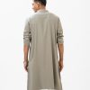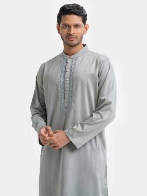 Men’s fitted panjabi in jacquard cotton fabric. Embroidery at mandarin collar and metal button placket.