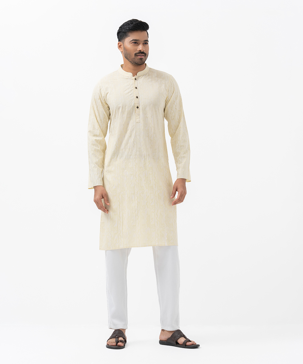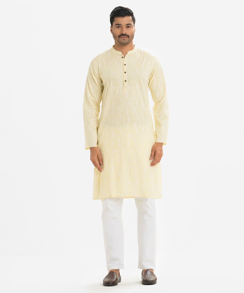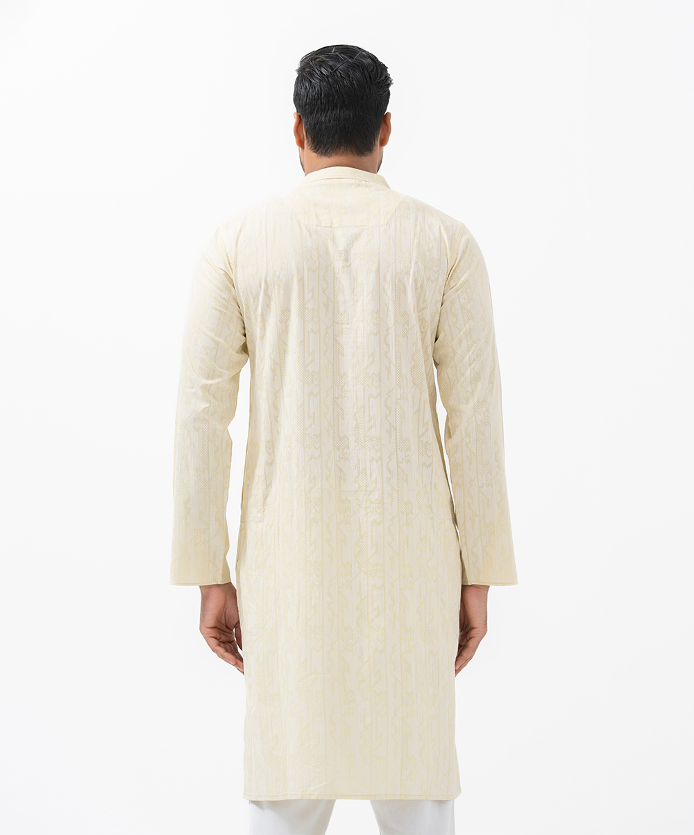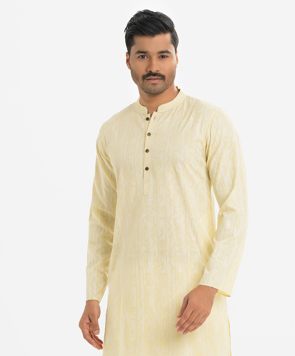 Men’s all over printed slim fitted panjabi in viscose fabric. Mandarin collar and full sleeves.