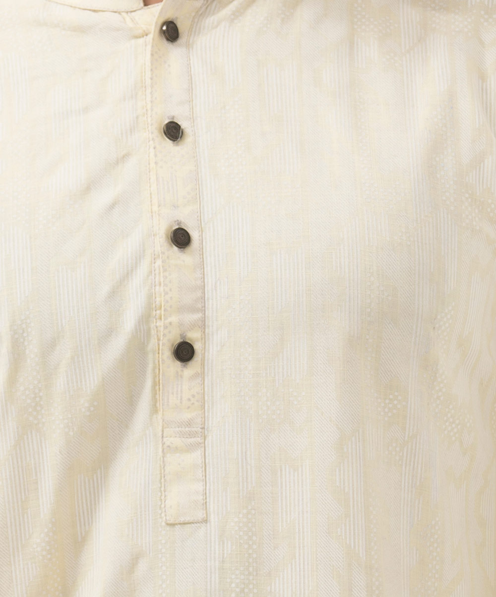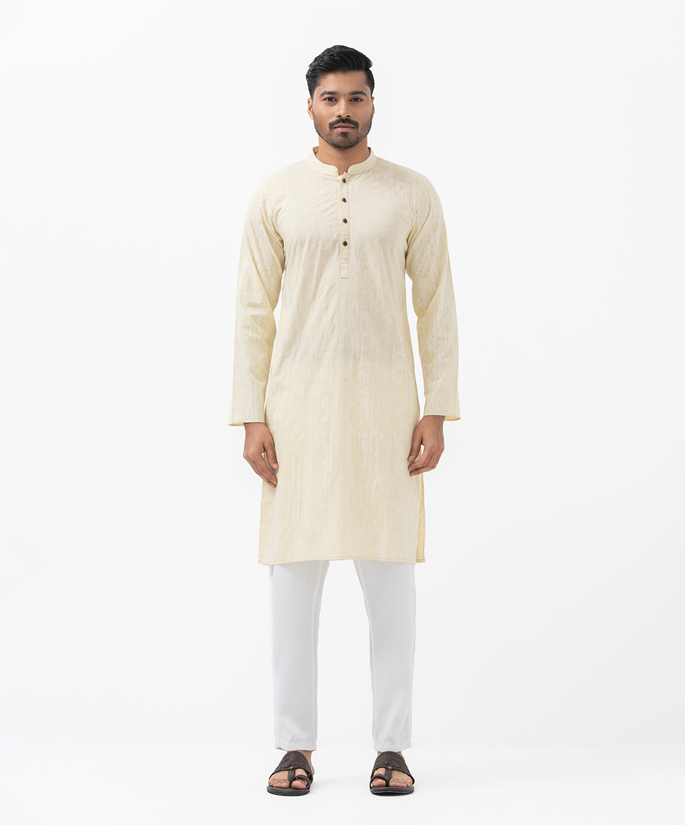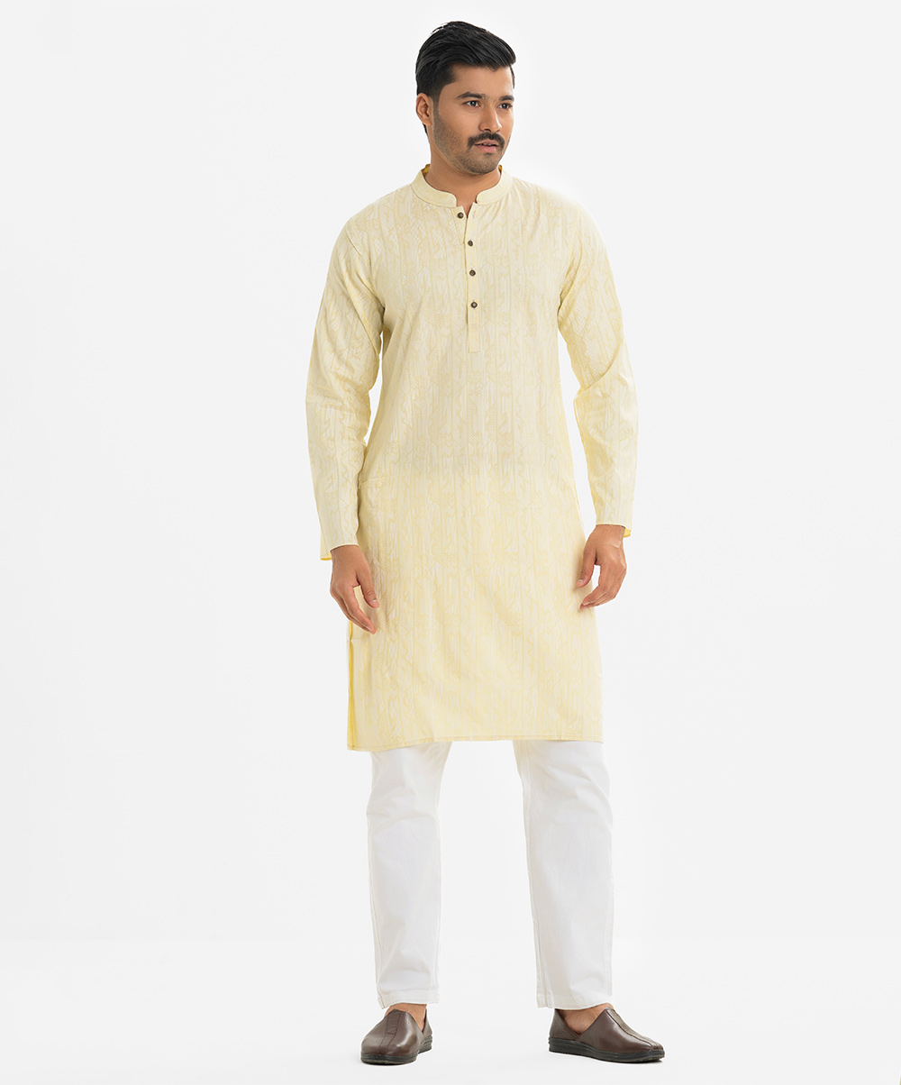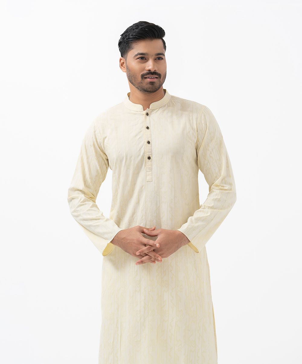 Men’s all over printed slim fitted panjabi in viscose fabric. Mandarin collar and full sleeves.