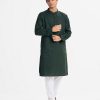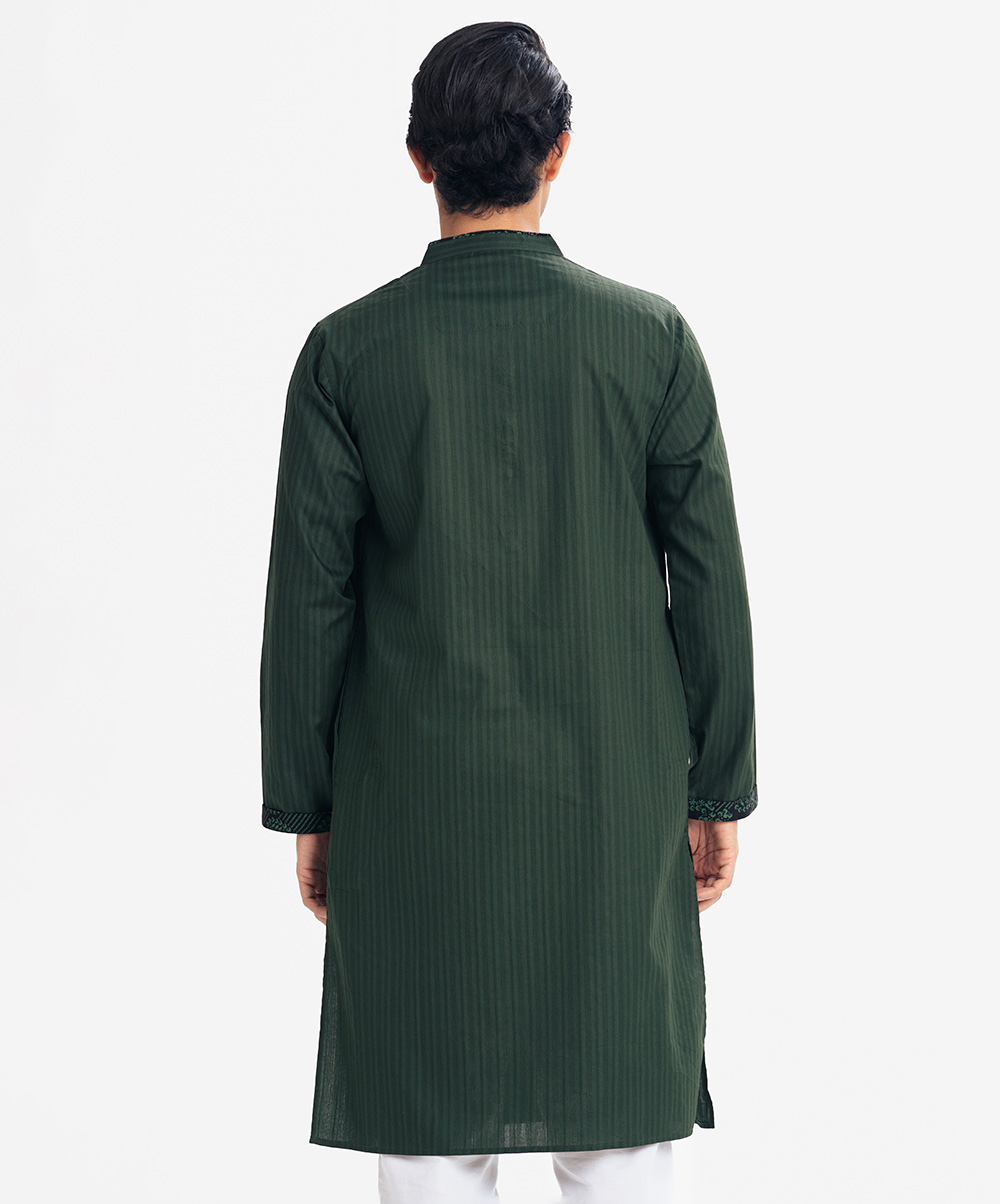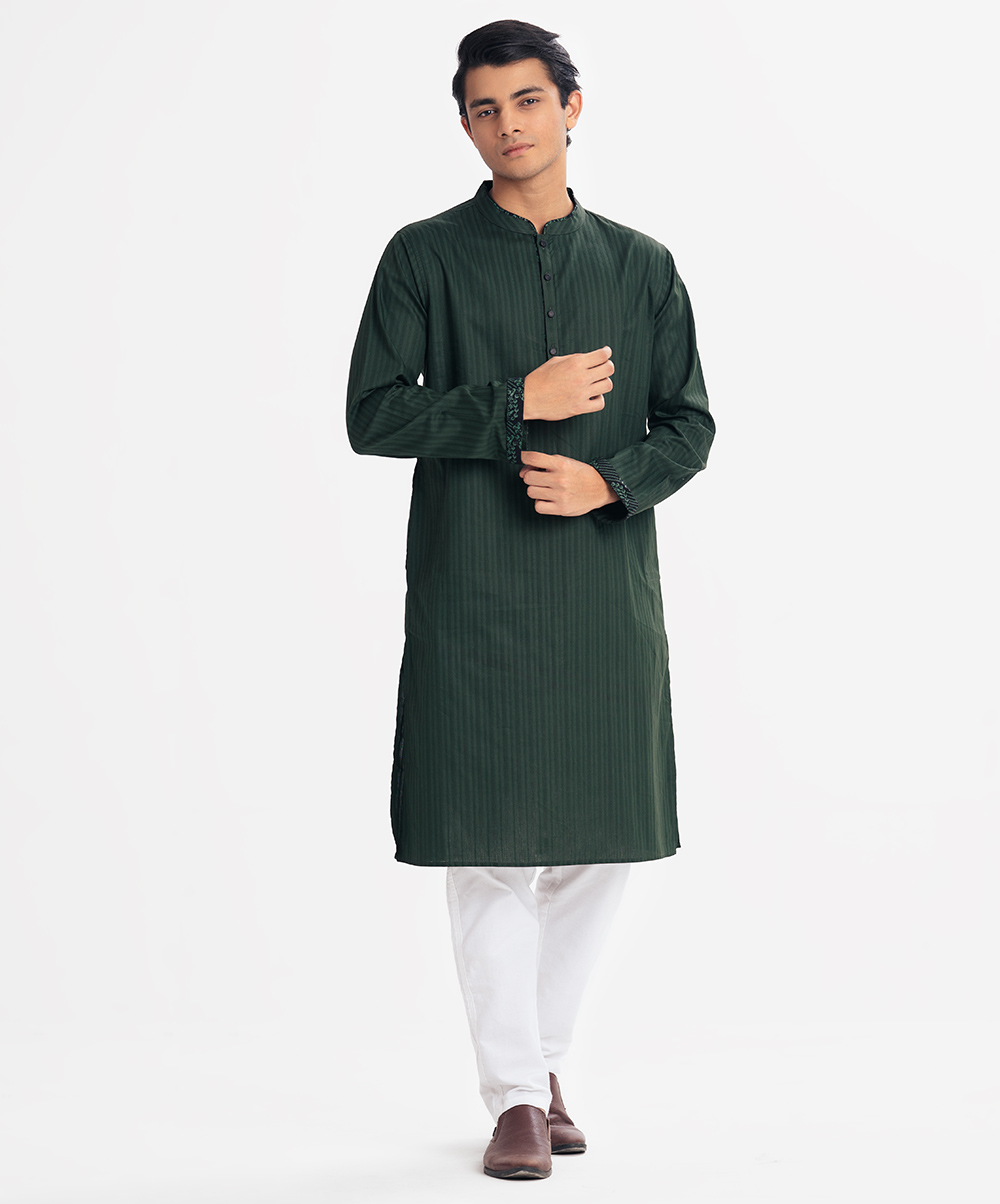 Men’s slim-fitted panjabi in Jacquard fabric. Mandarin collar and inseam pockets.