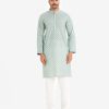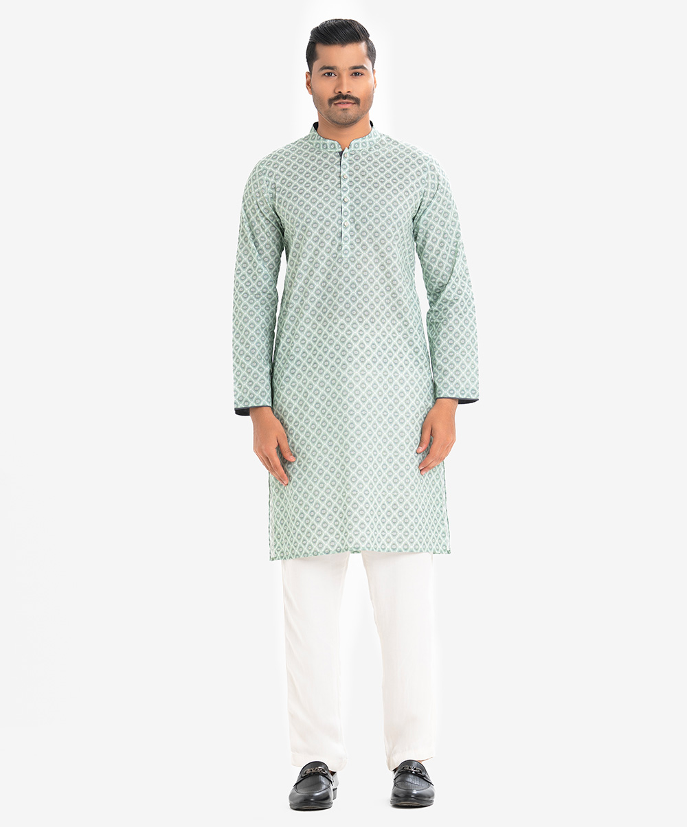 Mens printed slim-fitted panjabi in cotton fabric. Mandarin collar, inseam pockets and long sleeves.