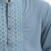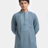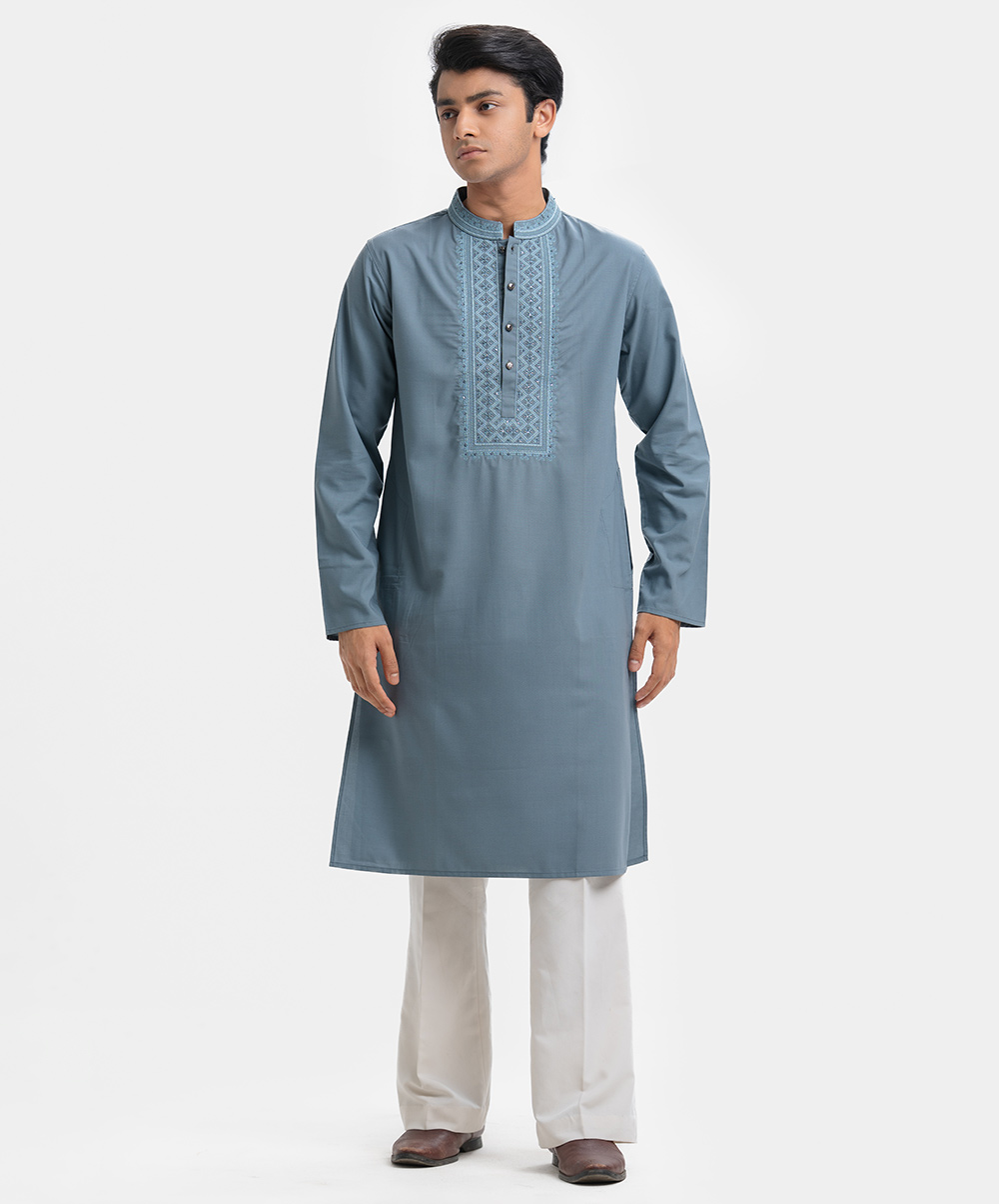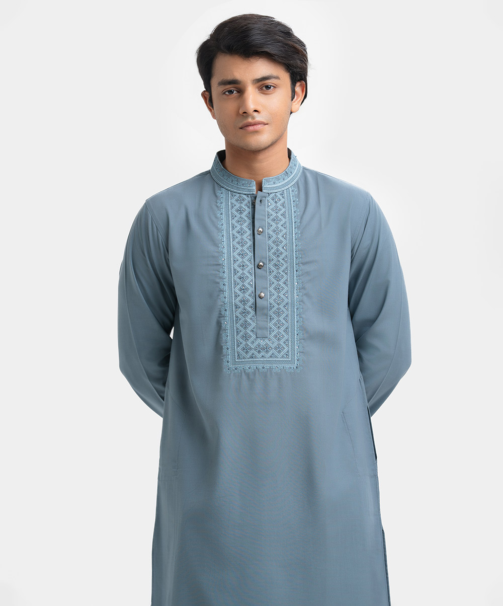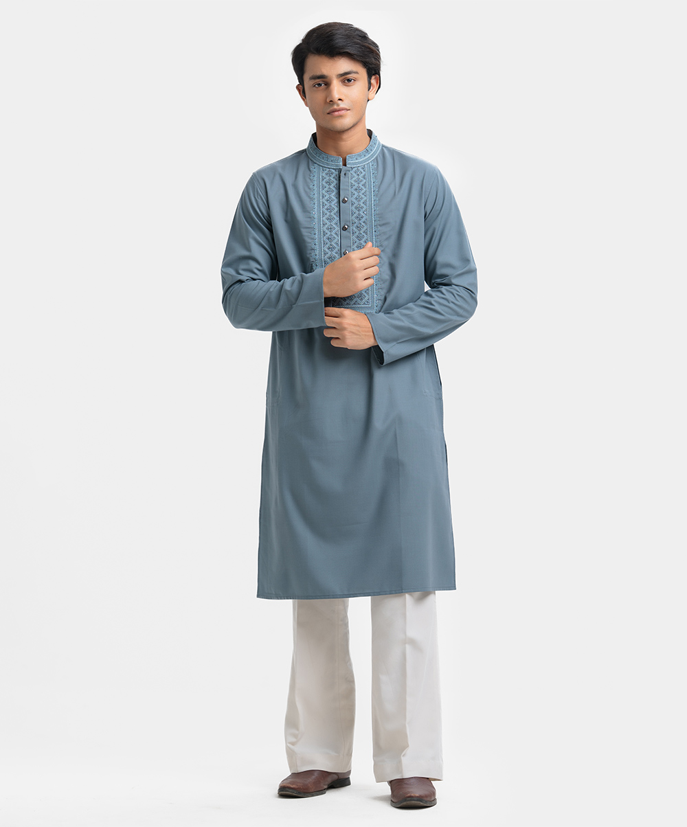 Men’s slim fitted panjabi in blended fabric. Mandarin collar and inseam pockets. Embroidery & karchupi at the front.