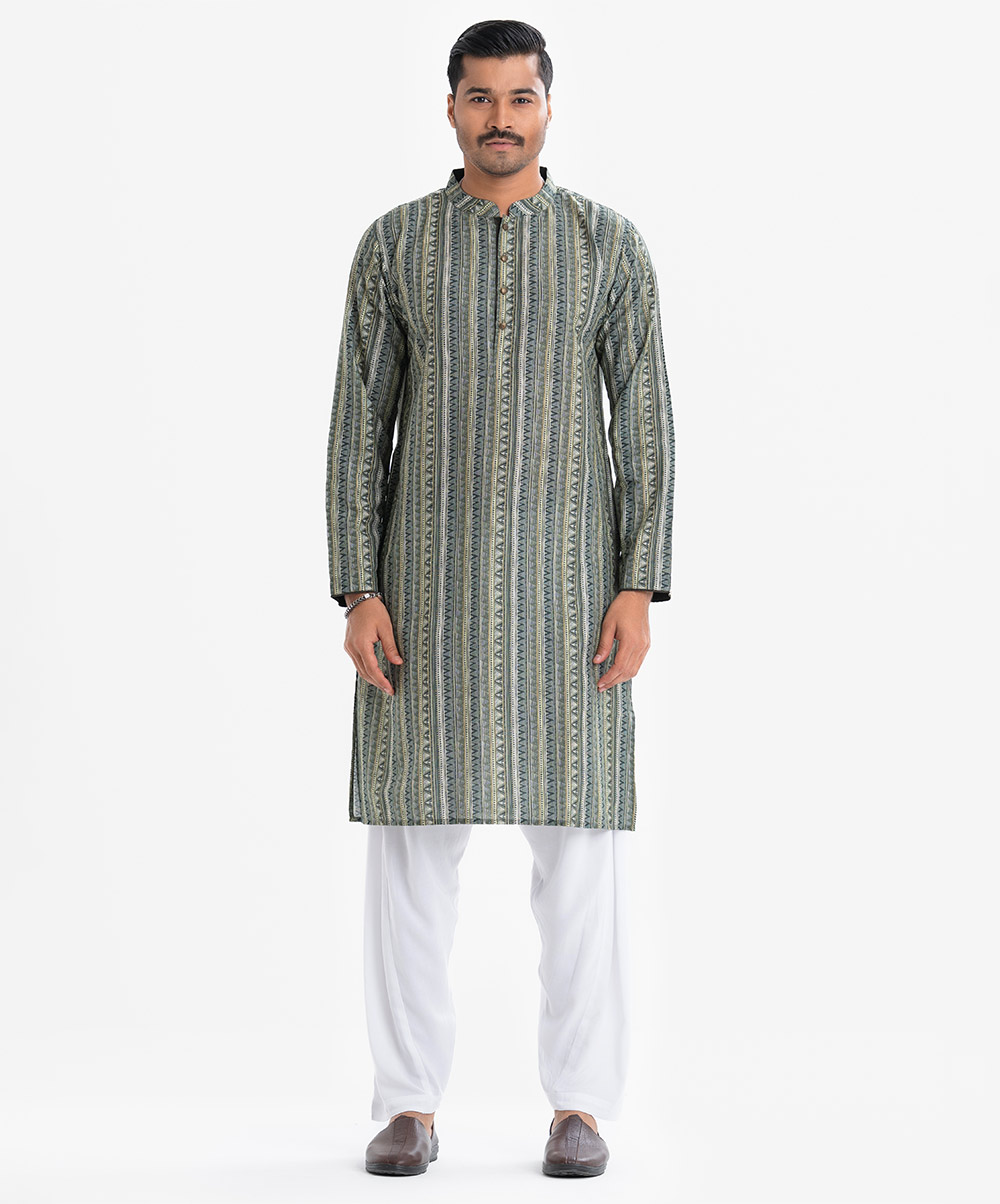 Men’s aztec printed fitted panjabi in cotton fabric. Mandarin collar with metal buttons placket and inseam pockets.