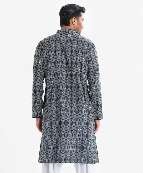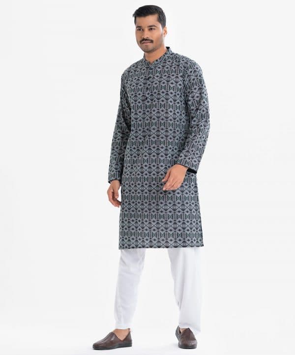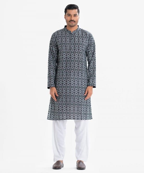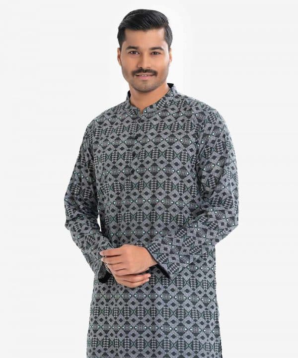 Men’s geometric printed fitted panjabi in cotton fabric. Mandarin collar with metal buttons placket, full sleeves and inseam pockets.