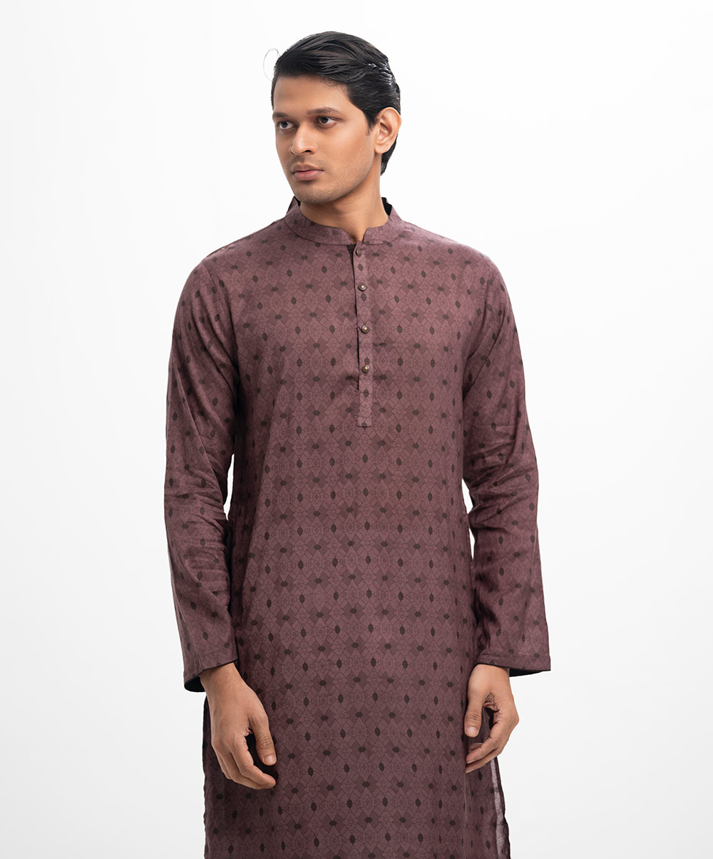 Men’s printed fitted panjabi in cotton fabric. Mandarin collar, buttons placket & full sleeves. Inseam pockets.
