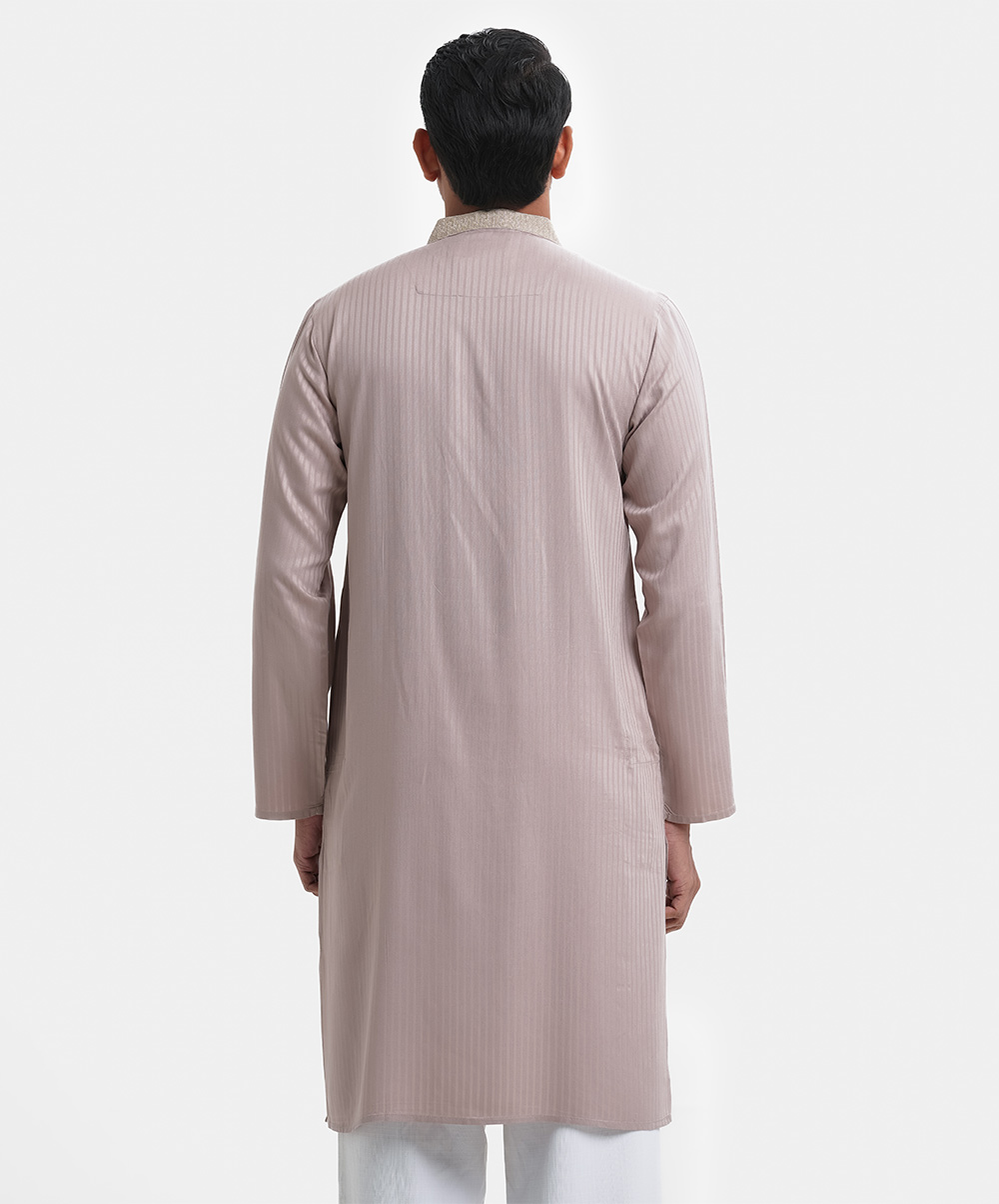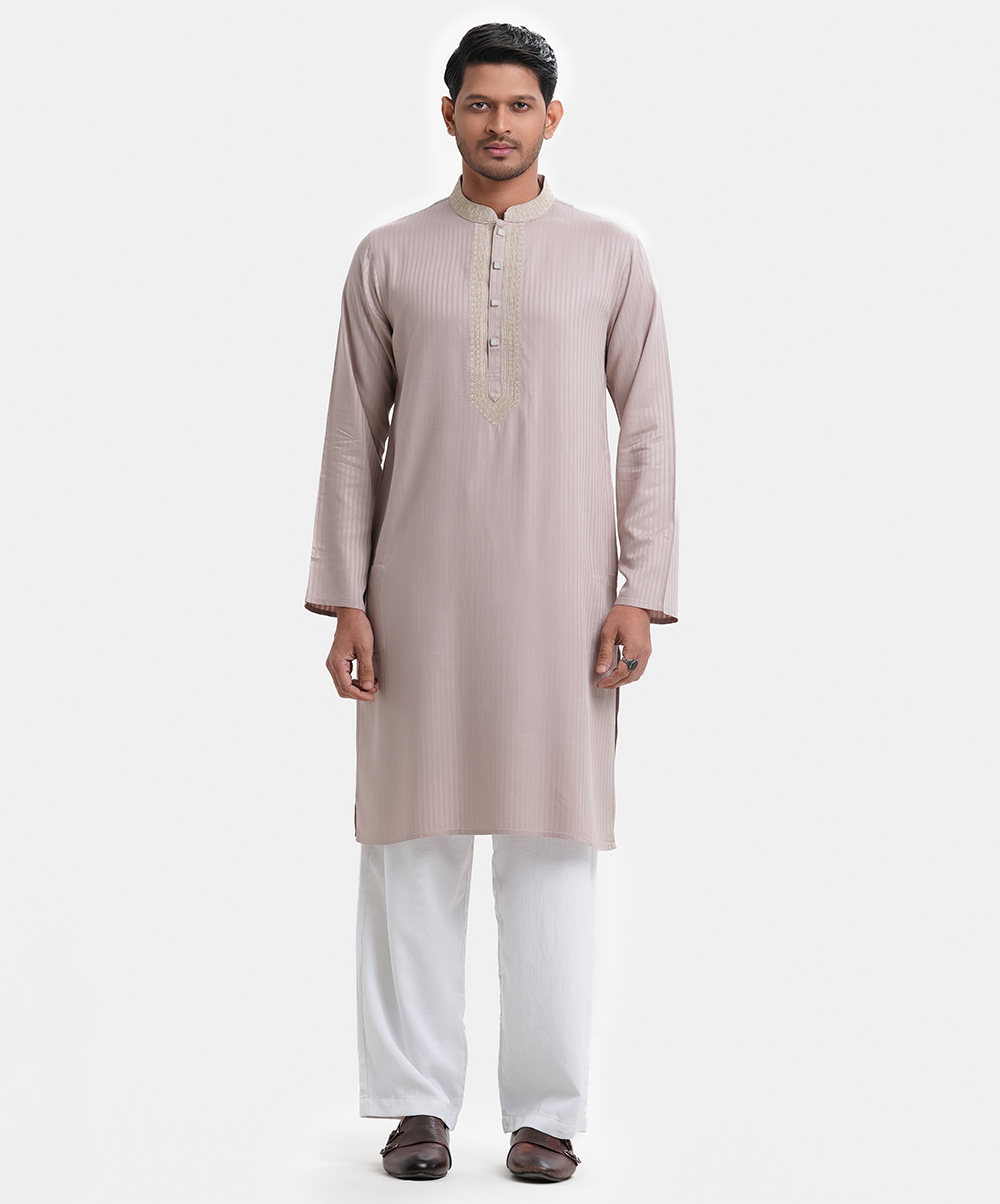 Men’s fitted panjabi in jacquard cotton fabric. Embroidery at mandarin collar, buttons placket side. Full sleeves & inseam pockets.