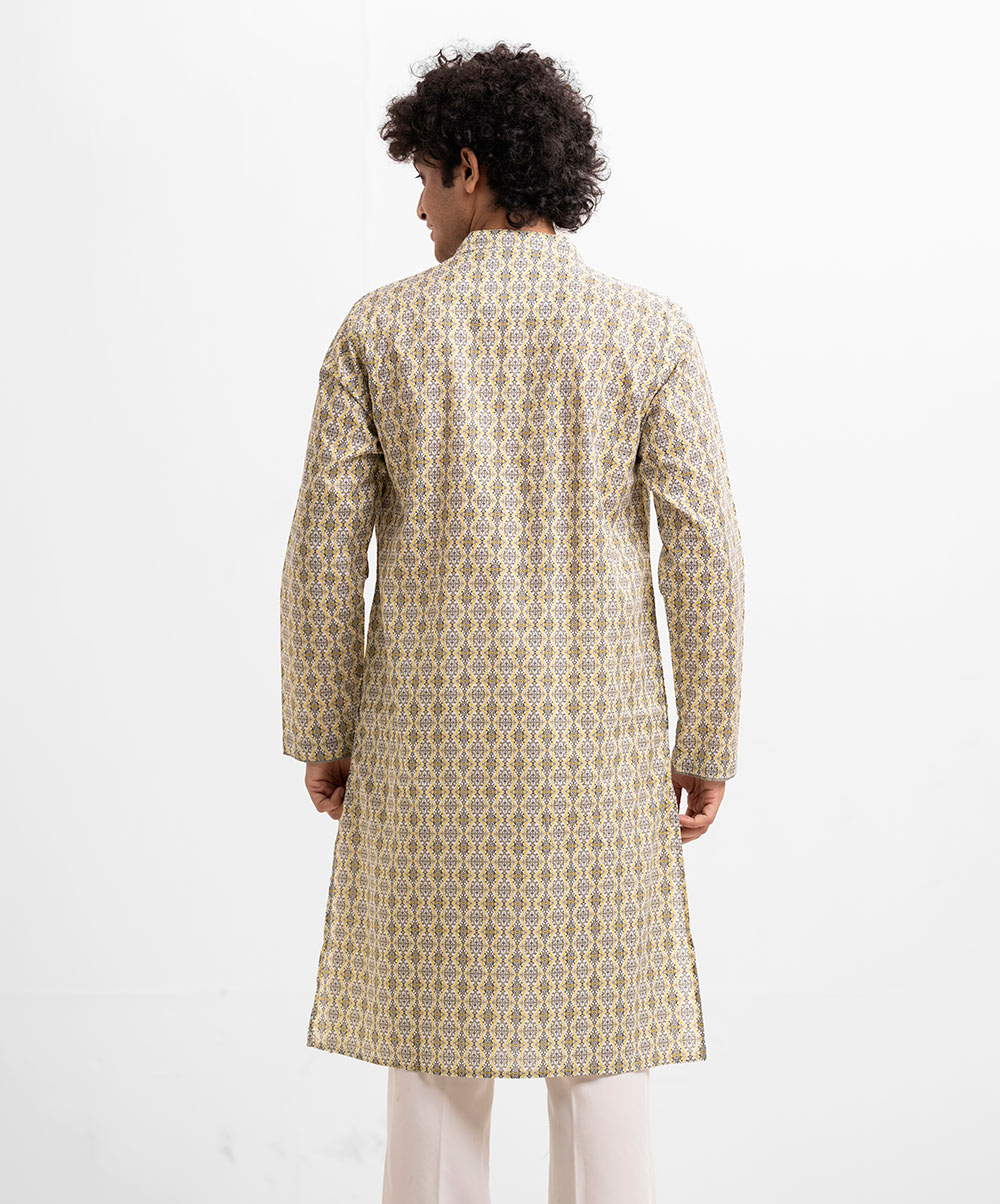 Men’s printed fitted panjabi in cotton fabric. Mandarin collar, buttons placket & full sleeves. Inseam pockets.