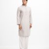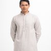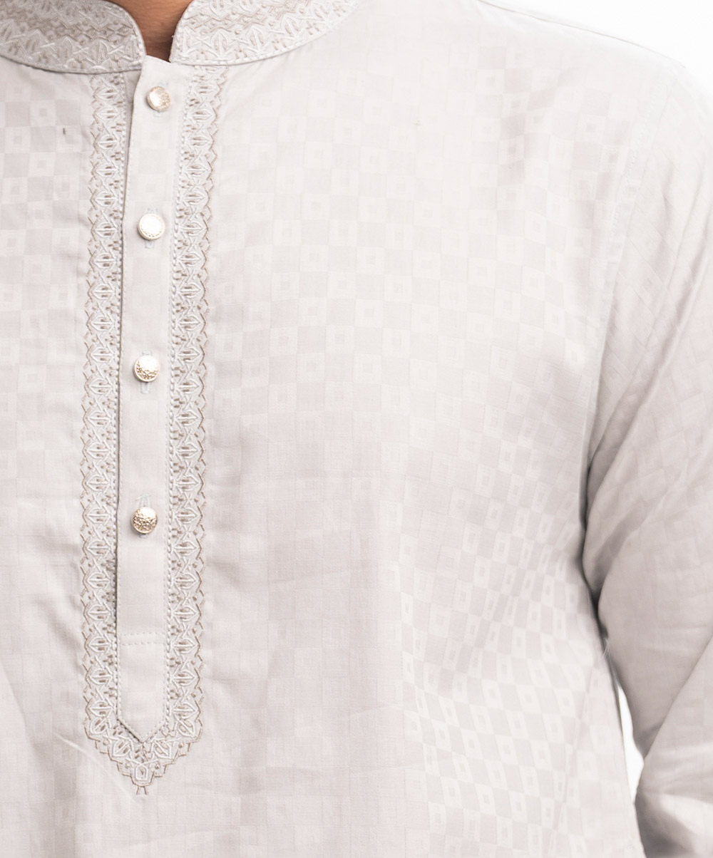 Slim fit panjabi in cotton jacquard fabric. Mandarin sleeves, embroidery on the collar and placket. Inseam side pockets.