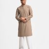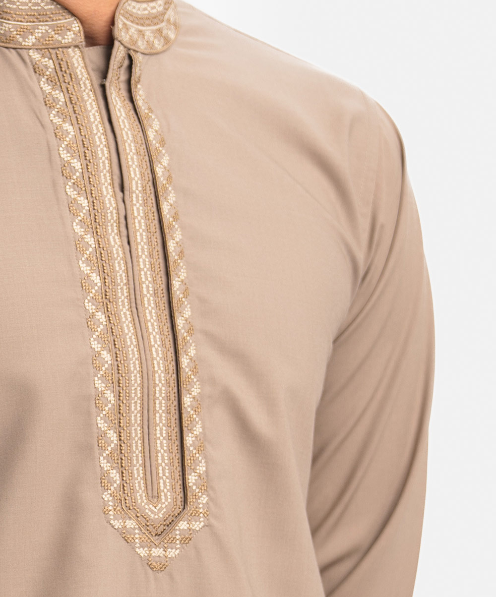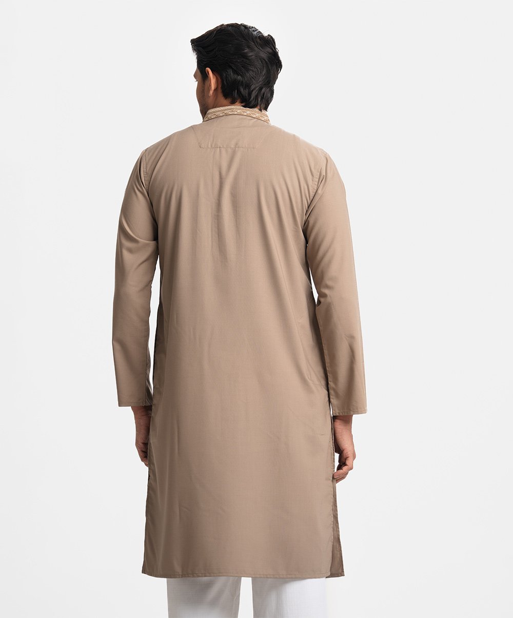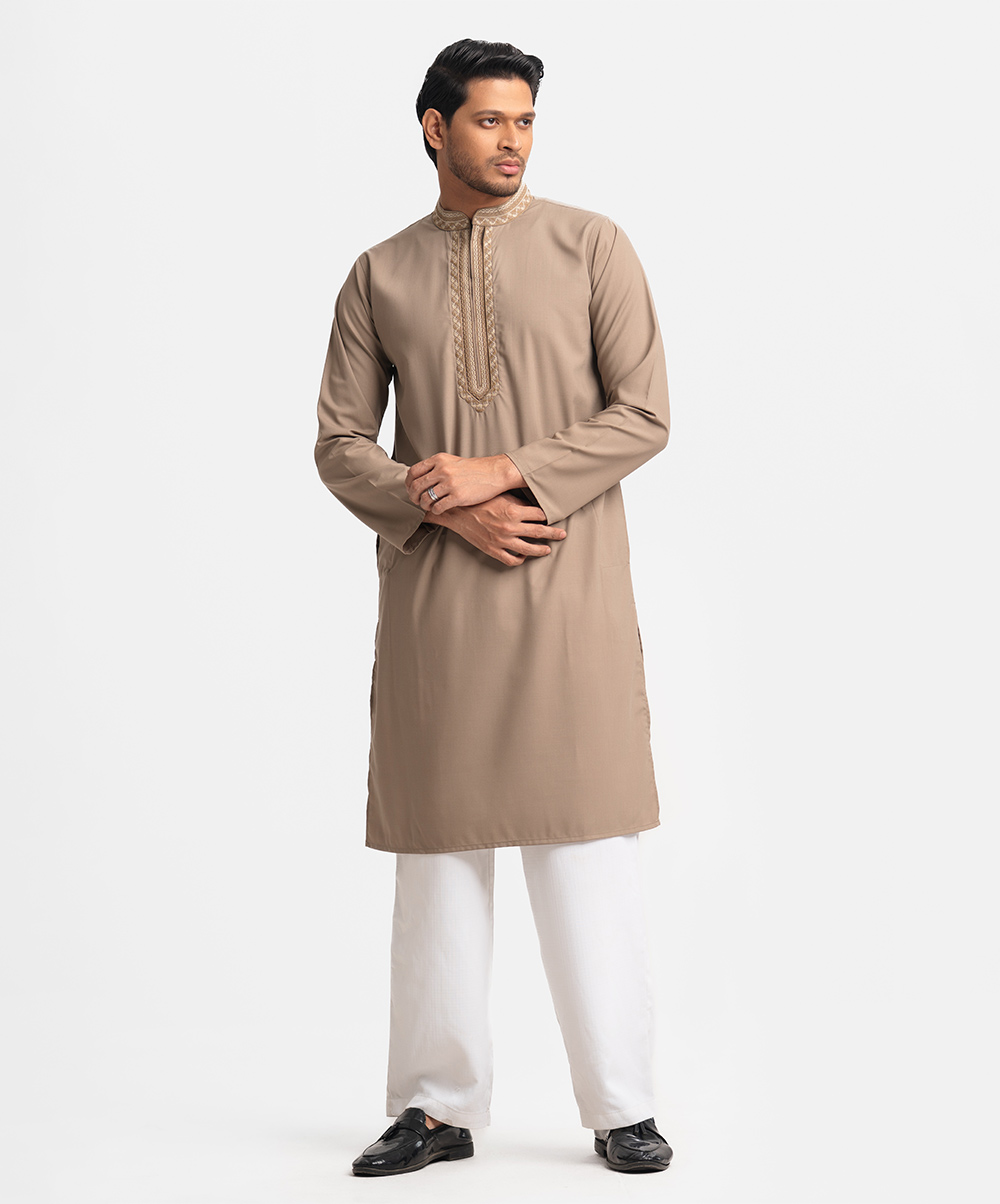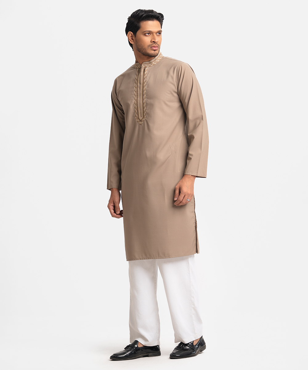 Men’s fitted panjabi in blended fabric. Embroidery on the collar and placket. Inseam side pockets.