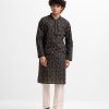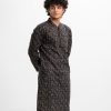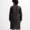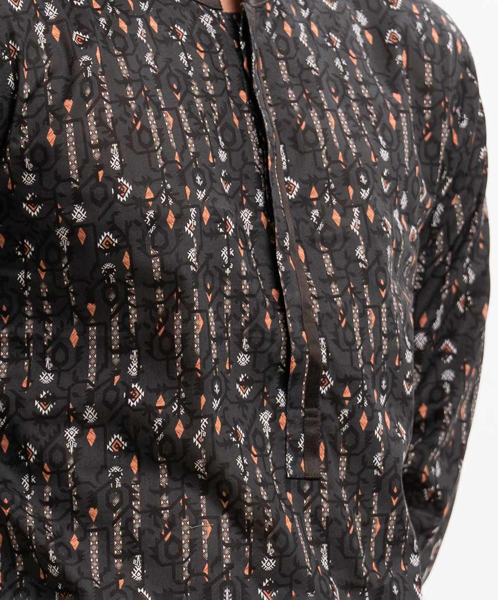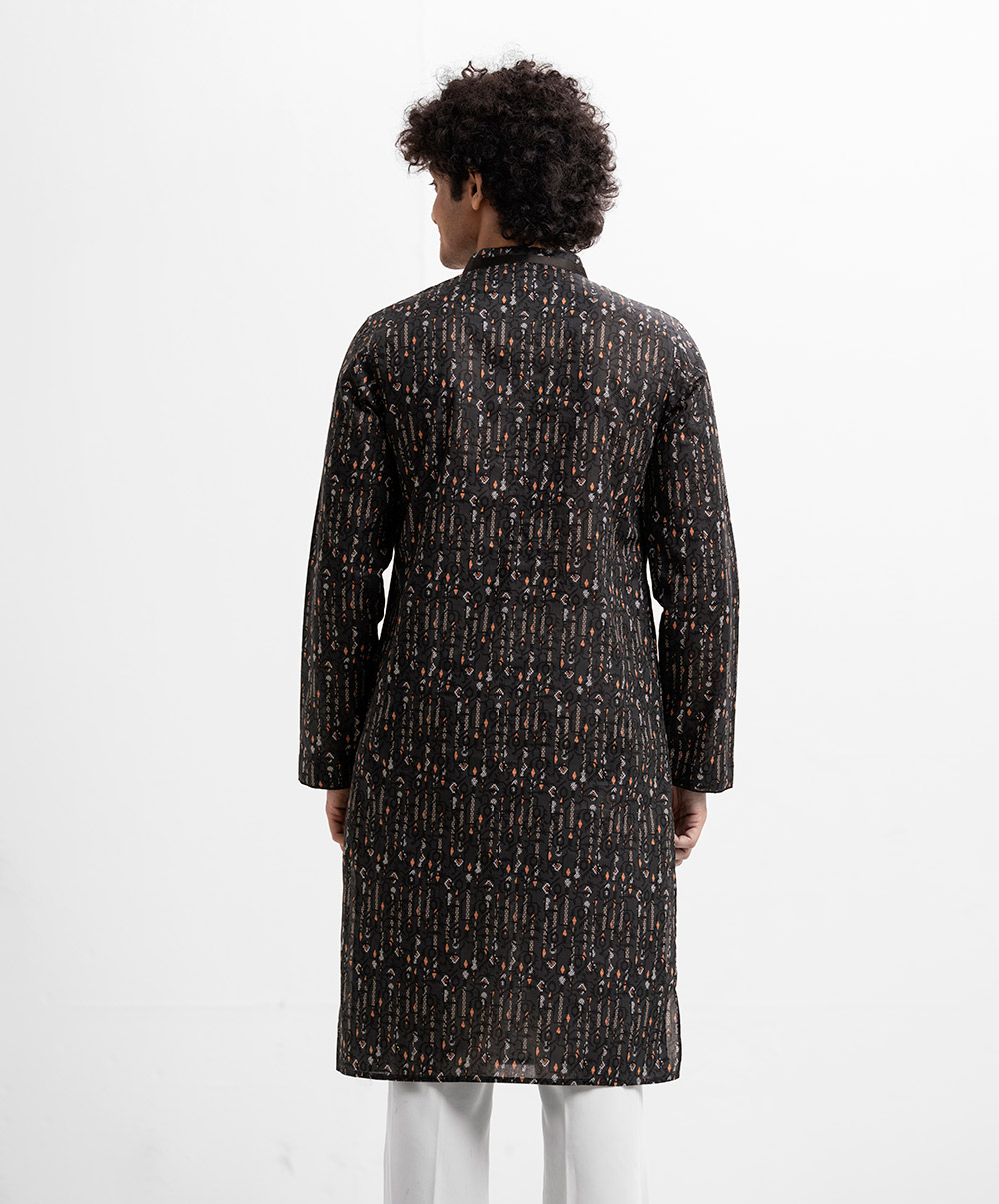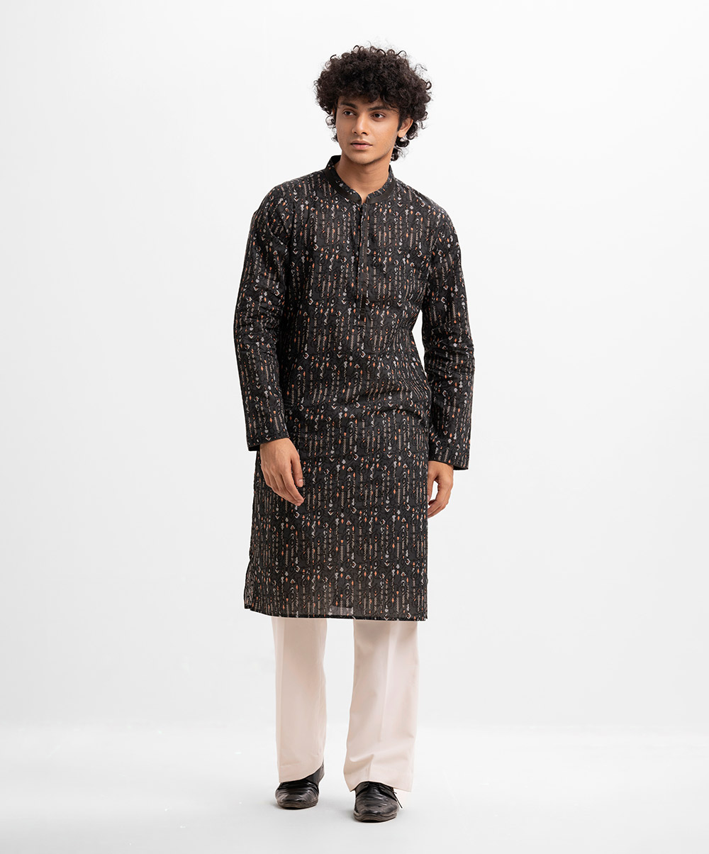 Fitted Panjabi in cotton fabric. Fine ribbon patch on the collar and placket. Inseam pockets on the sides.