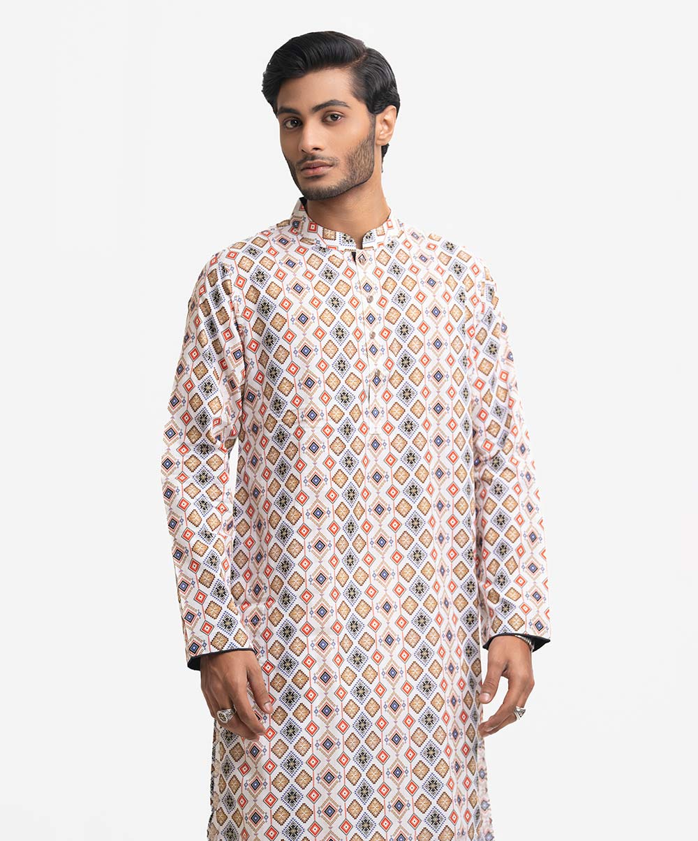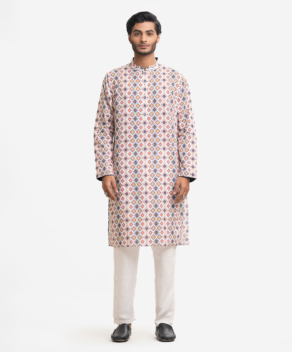 Men’s fitted panjabi in cotton fabric. Long sleeves, inseam side pockets.