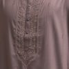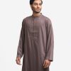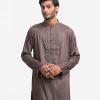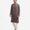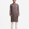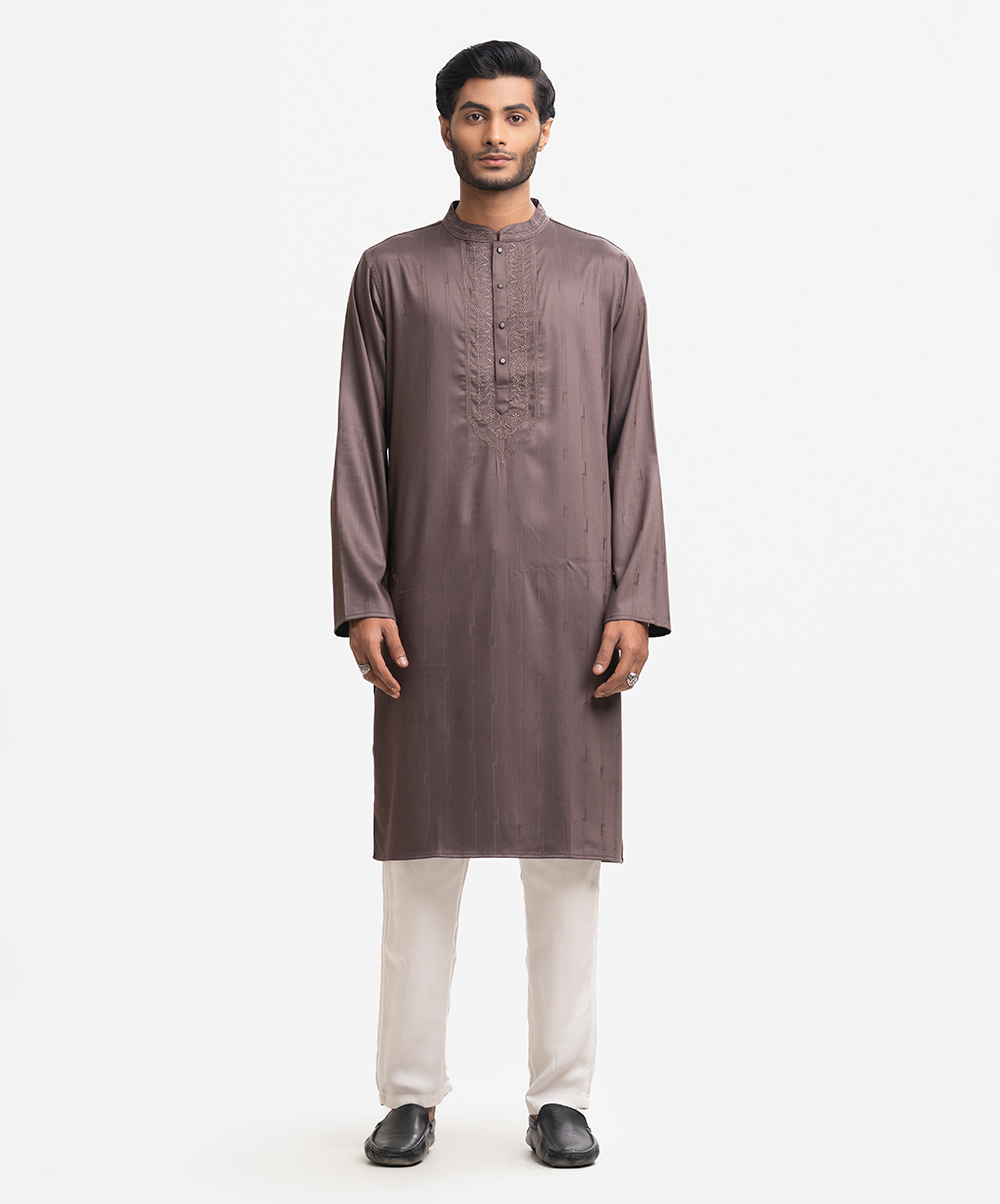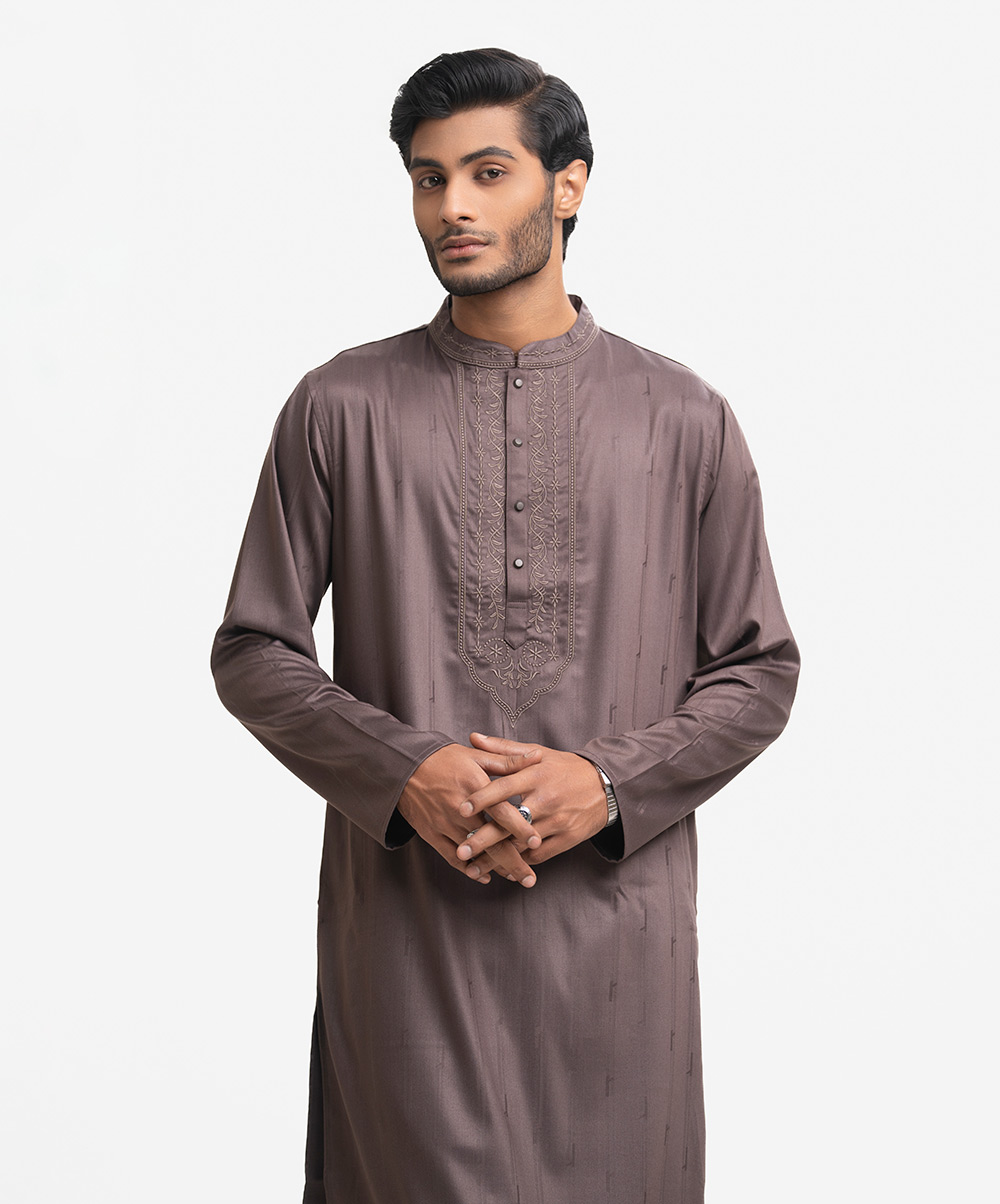 Men’s fitted panjabi in cotton jacquard fabric. Embroidery at the mandarin collar & placket. Inseam side pockets.