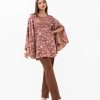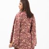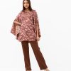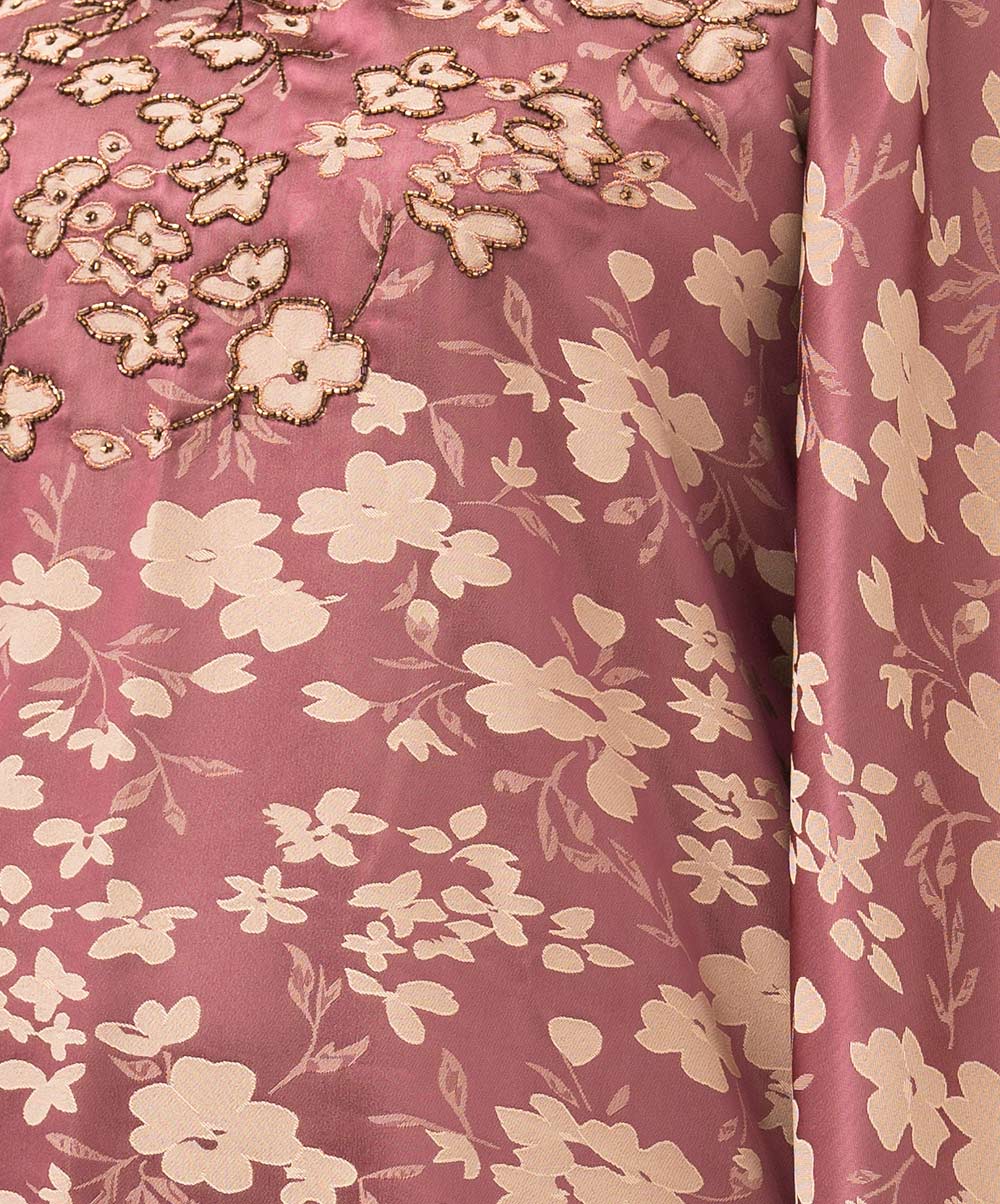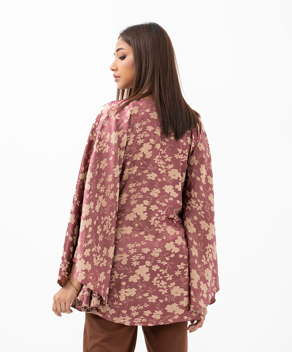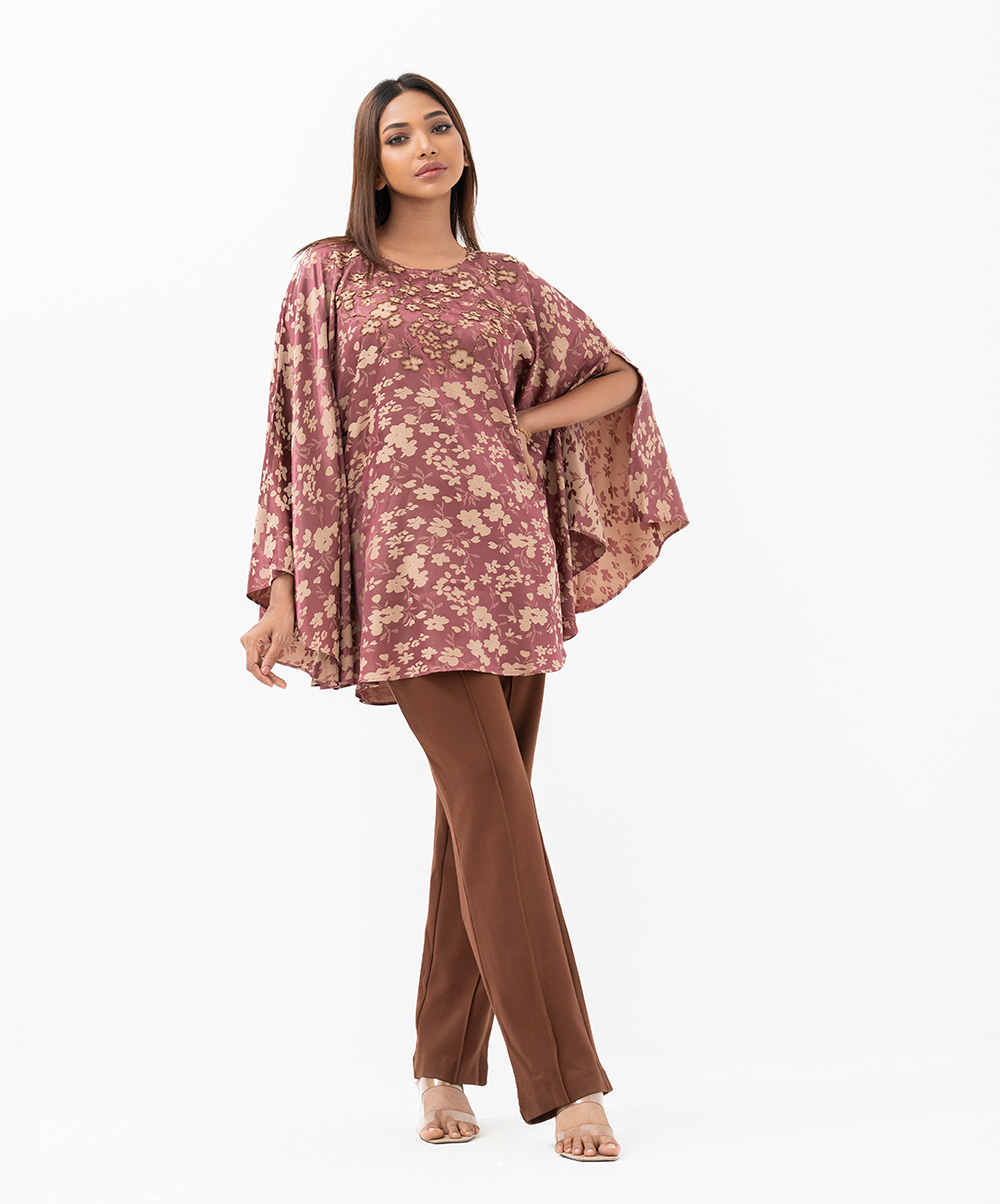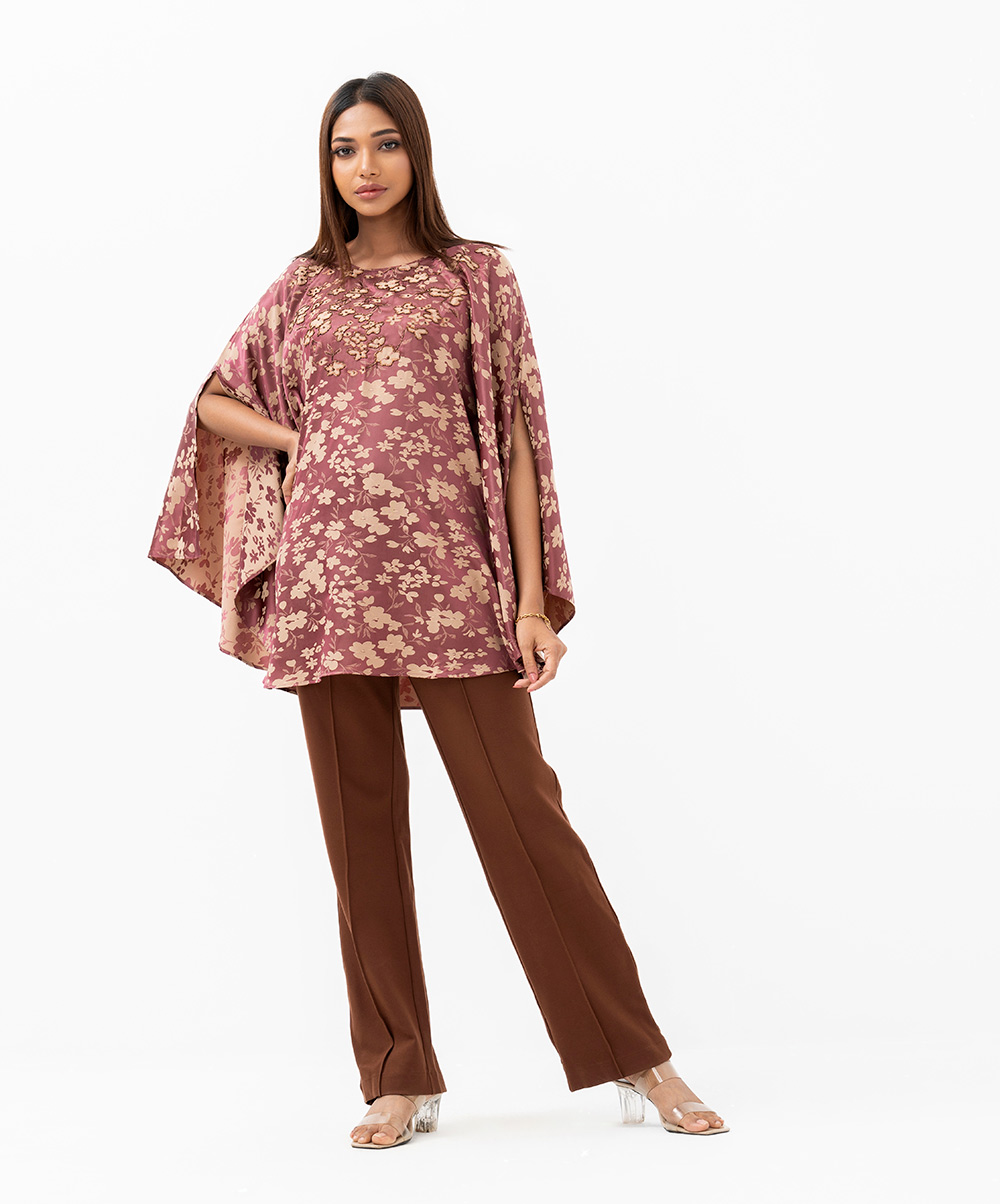 Women’s printed abaya cape in blended fabric. Decorative karchupi details at the front and round neck.