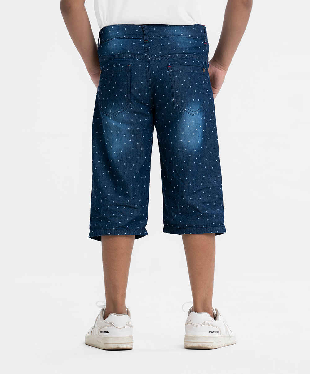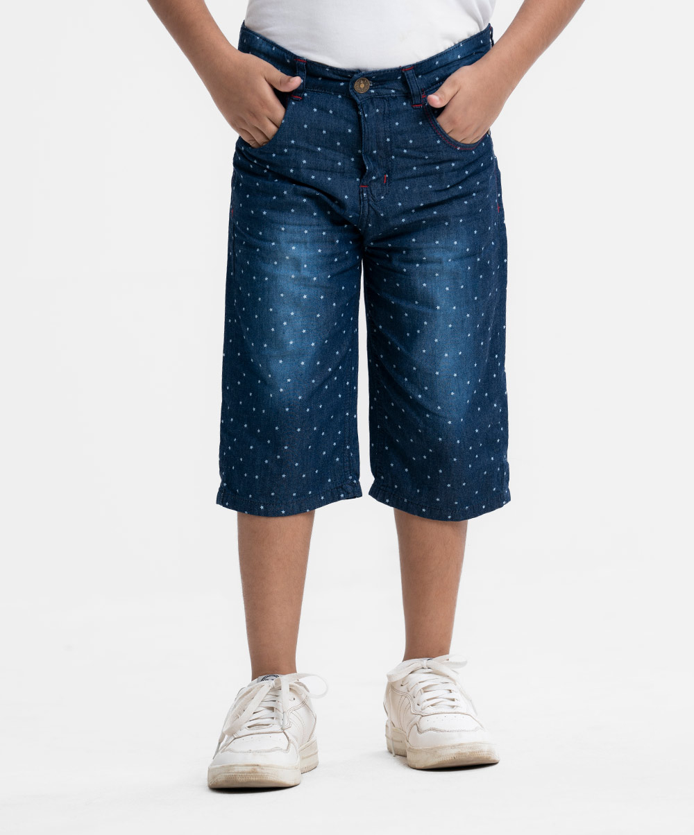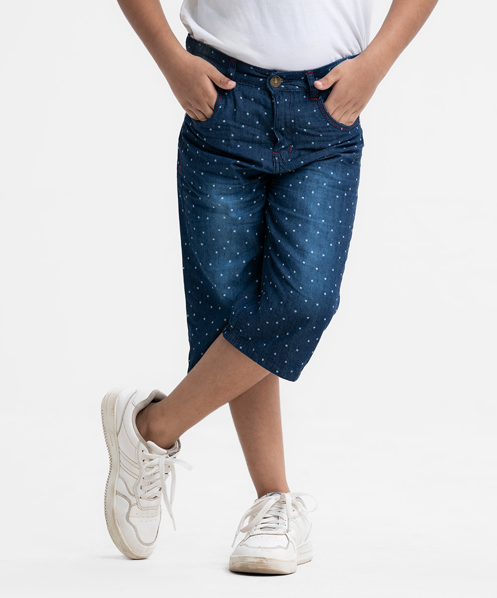 Kid boys printed jeans in denim fabric. Zipper-fly and a button fastening at the front. Two side pockets and two patch pockets on the back.