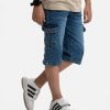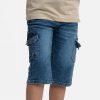Kid boys three-quarter pants in denim fabric. Zipper-fly and concealed elasticated waistline. Five utility pockets at front and back. Two extra mobile pockets.