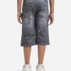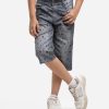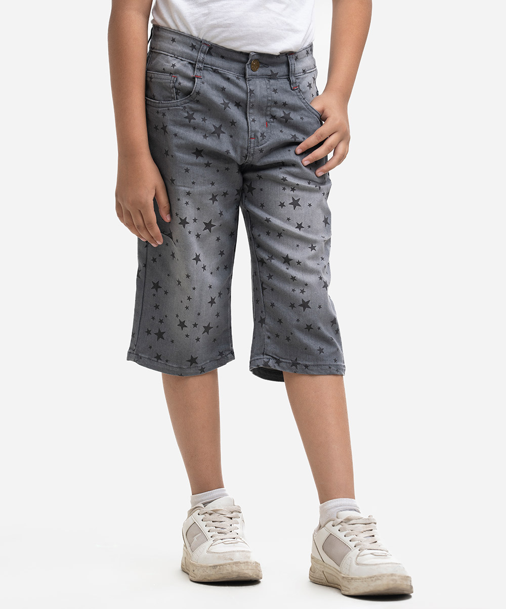 Kid boys star printed three-quarter pants in denim fabric. Zipper-fly and concealed elasticated waistline. Five utility pockets at front and back.