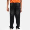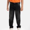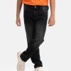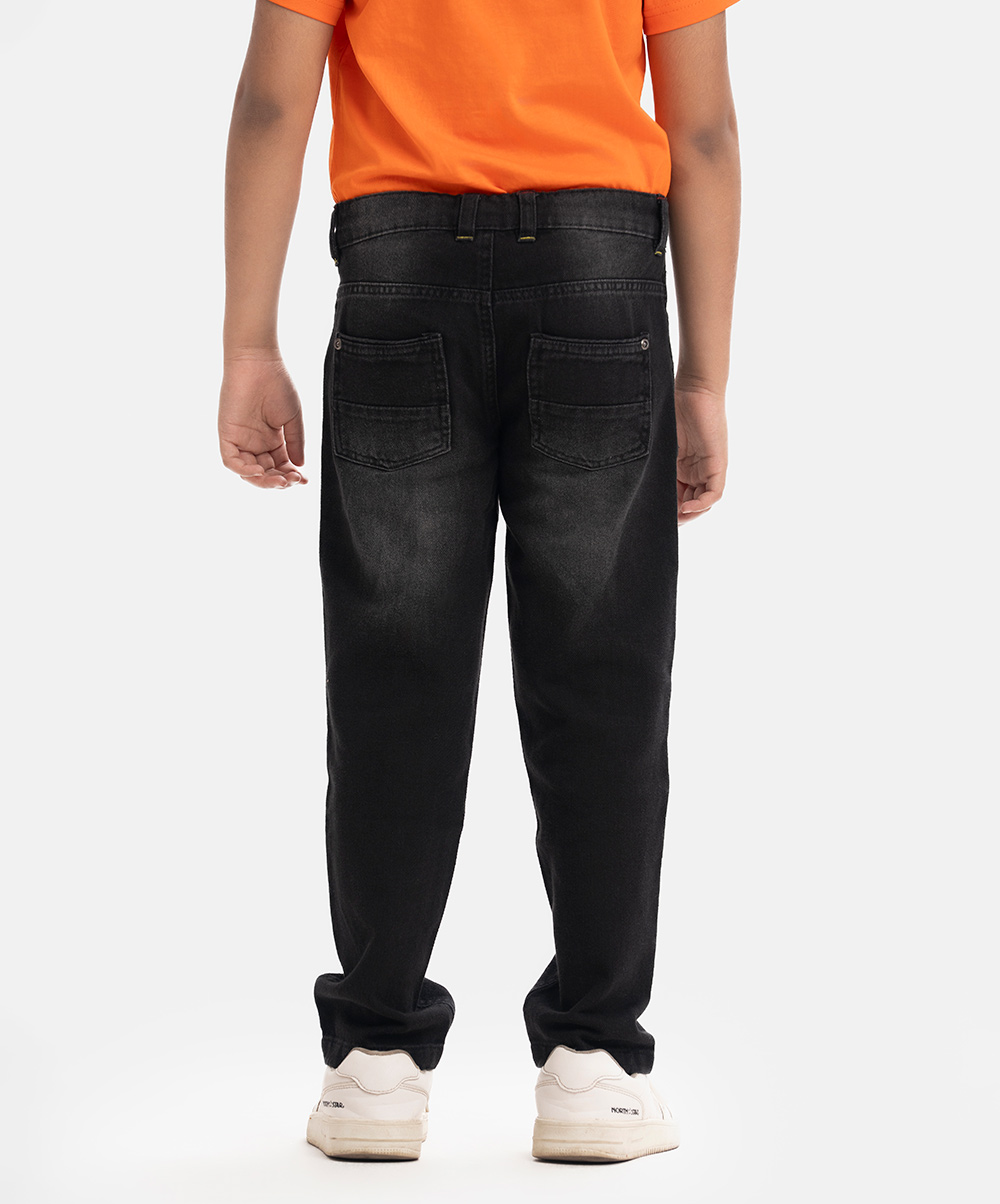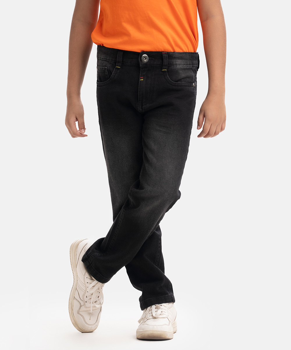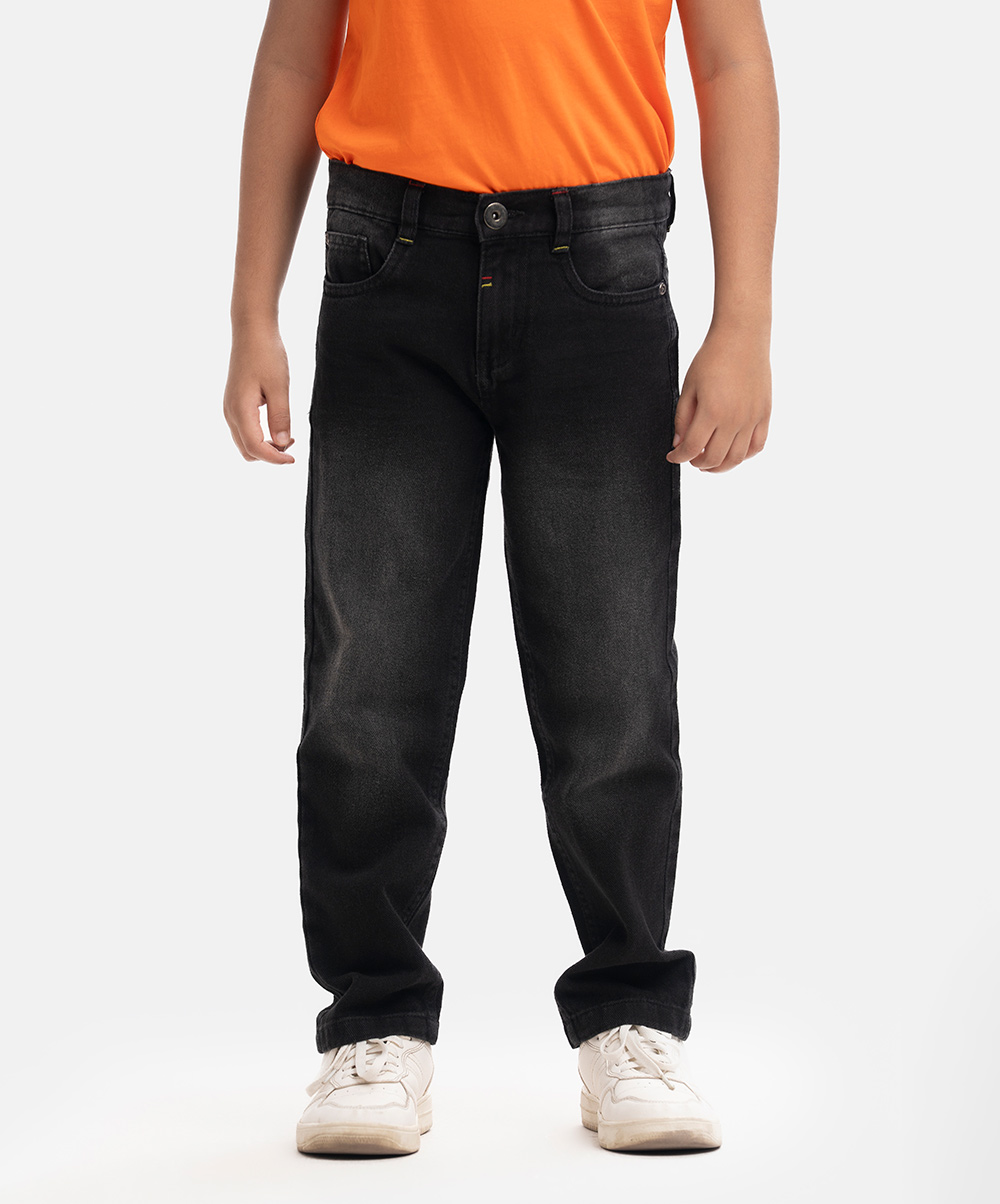 Kid boys long pants in denim fabric. Five pockets and a zipper fly with a metal button.