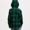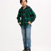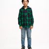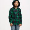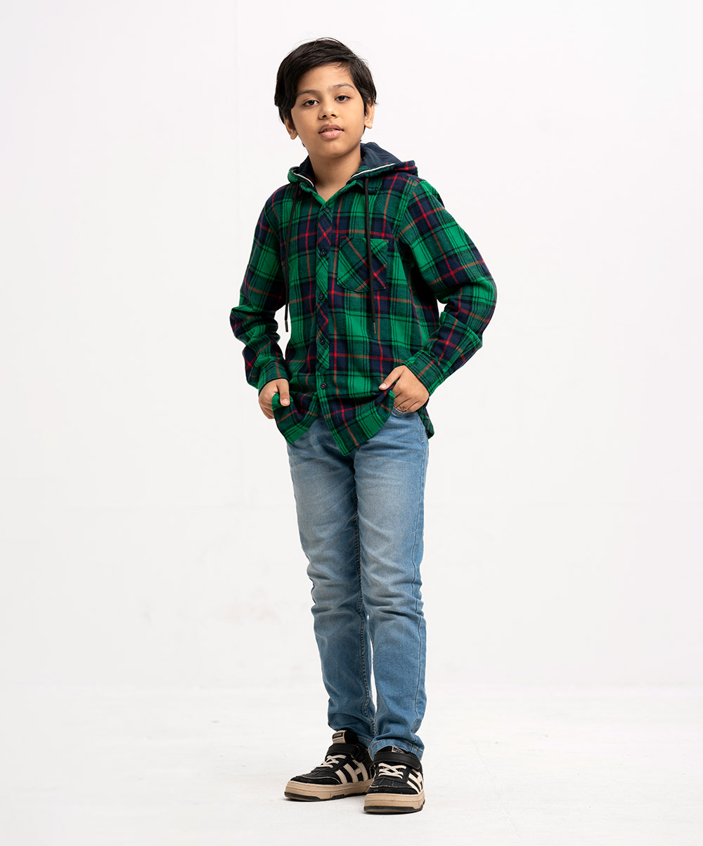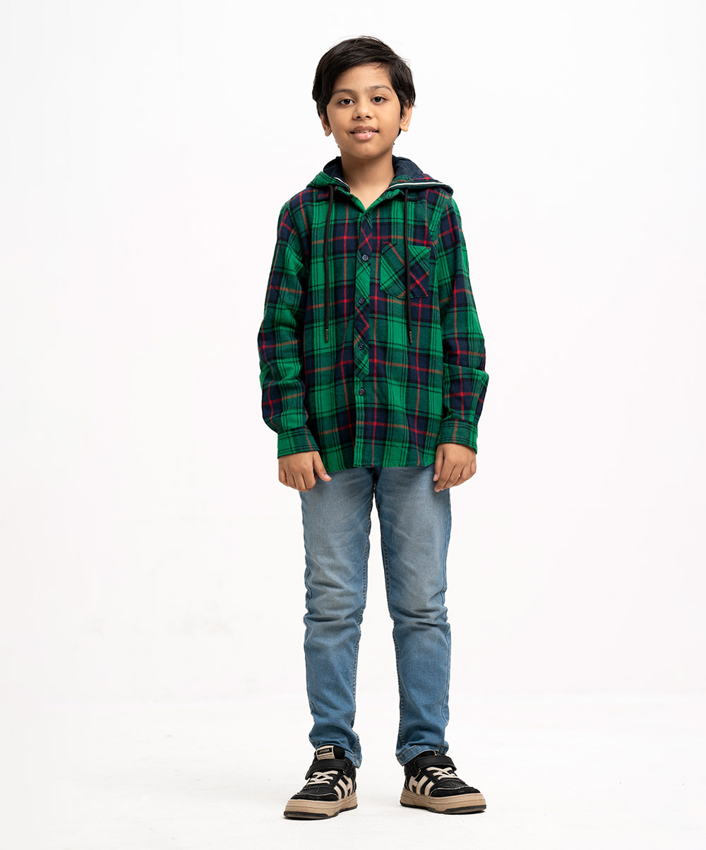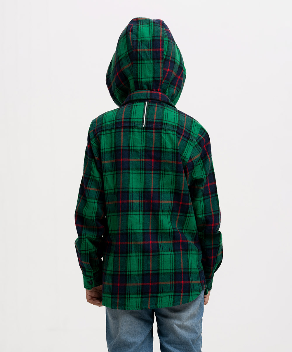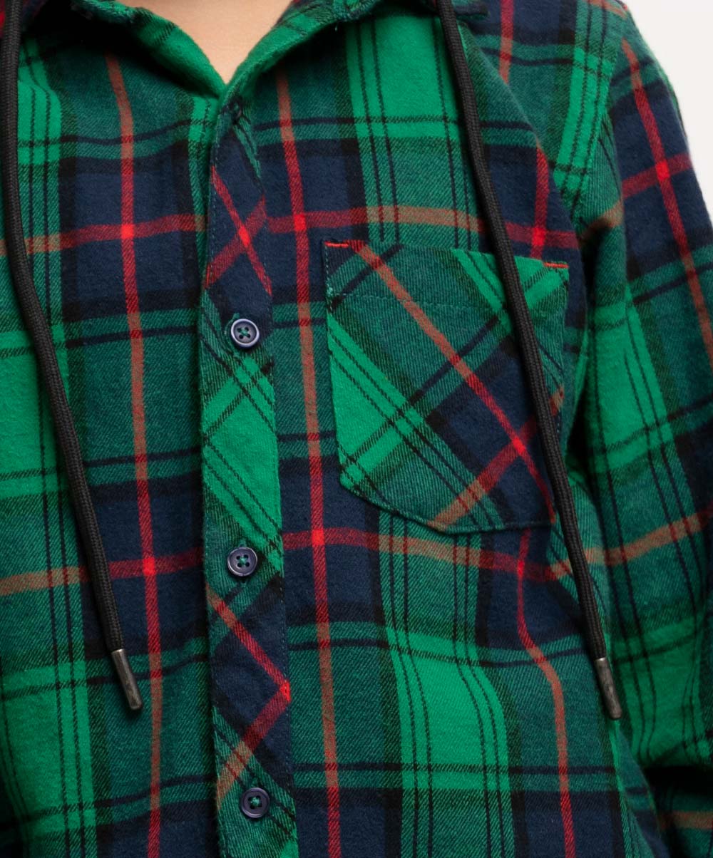 Kid boys long-sleeve hoodie shirt in cotton flannel fabric. Buttons opening at the front, an adjustable drawstring at hood and a chest pocket.