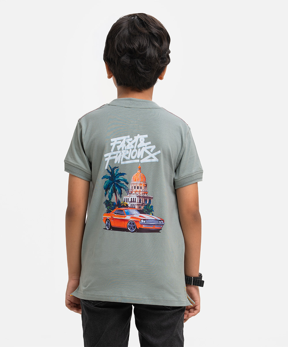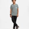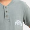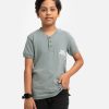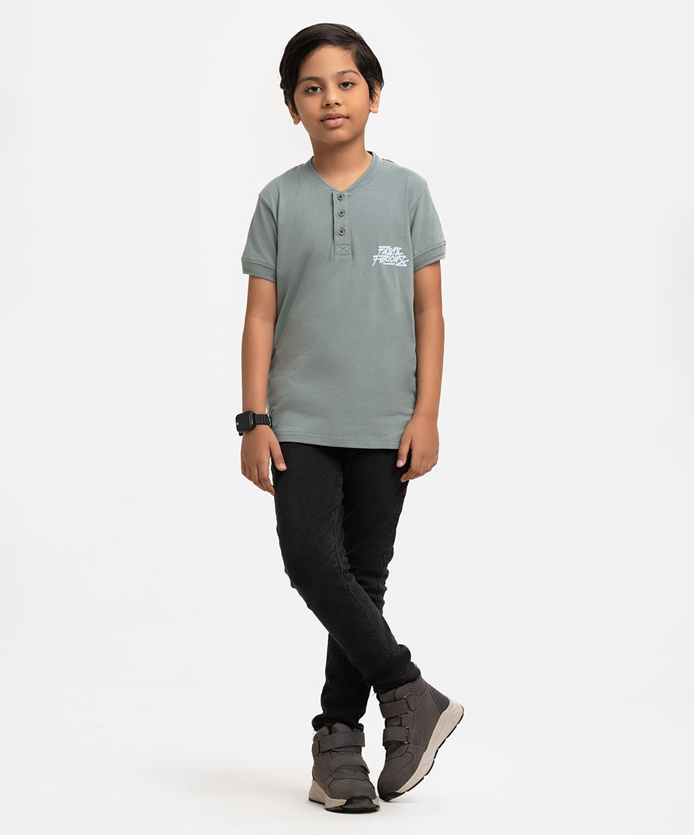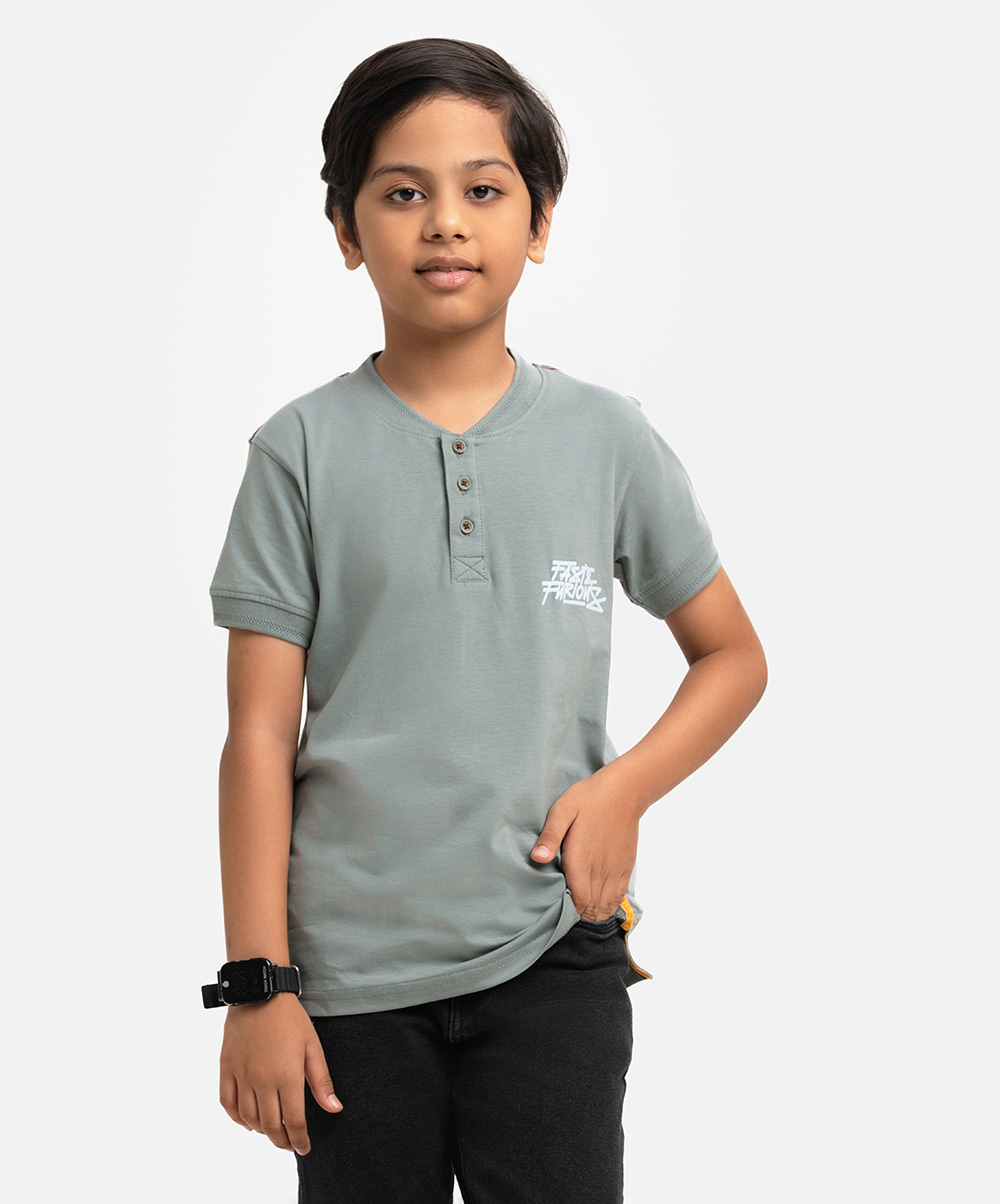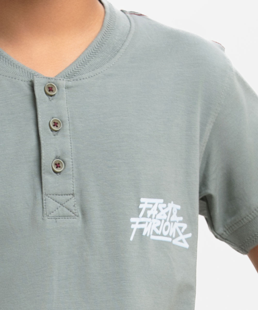 Kid boys’ Henley t-shirt in stretched cotton fabric. Crew neck, short sleeves, and print on the chest.