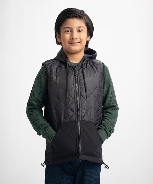 Kid boys sleeveless jacket in taffeta quilting fabric. Zipper opening at the front, adjustable drawstring at hood and two kangaroo pockets.