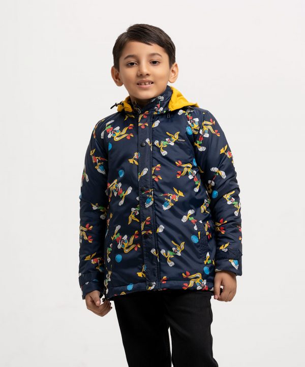 Kid boys cartoon printed jacket in taffeta fabric. Funnel neck with the terry fabric hoodie and drawstring cord. Hidden zipper opening with buttons fastening and two kangaroo pockets.